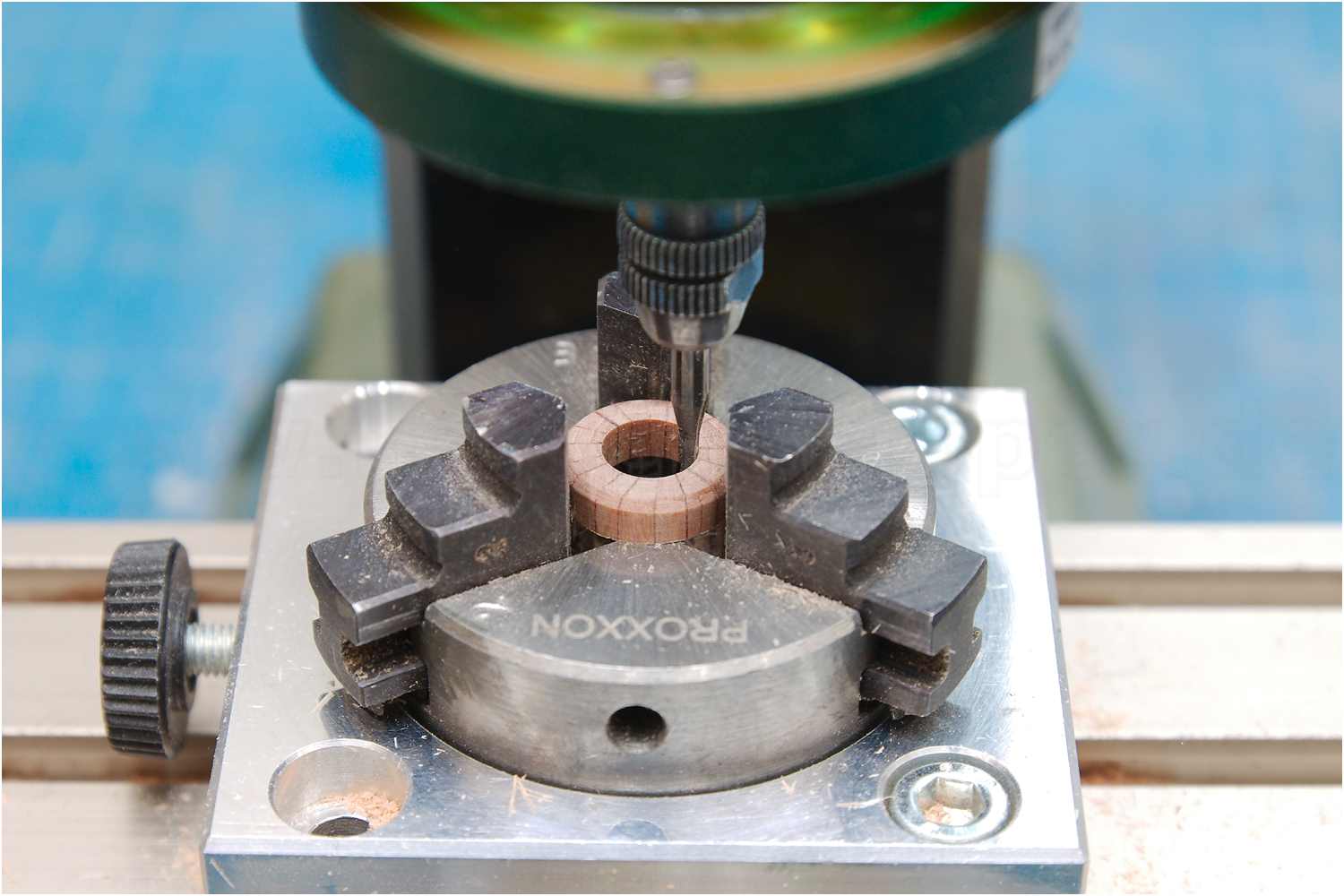 Hat man keine Drehbank zur Hand, aber eine Fräse mit Teilapparat, kann diese Bohrung nach dem Prinzip des Ausdrehens erweitert werden.