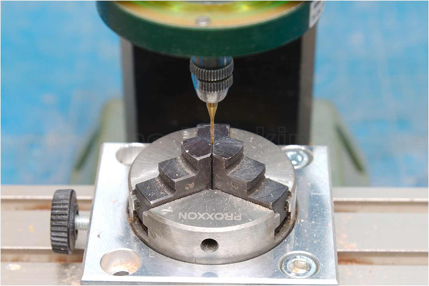 Dann das Werkstück einspannen, das Backenfutter des Teilapparat mit der Hand drehen und so mit mit laufendem Fräser das Loch erweitern. Den Arbeitstisch dann step-by-step in der Waagerechten verschieben, bis der gewünschte Durchmesser der Bohrung erreicht ist.