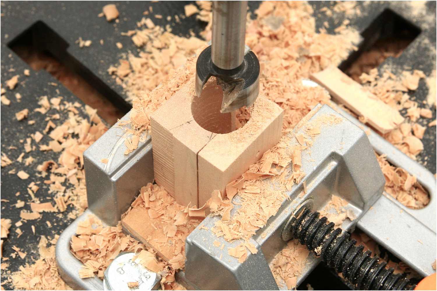 In diesem Fall nimmt man zwei Werkstücke und legt Füllmaterial dazwischen, z.B. einen weiteren Holzklotz oder mehrere Lagen Sperrholzreste und spannt diese zum Bohren in einen Schraubstock ein.