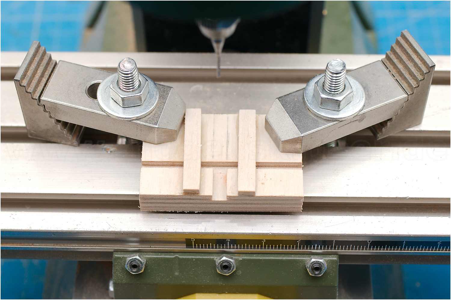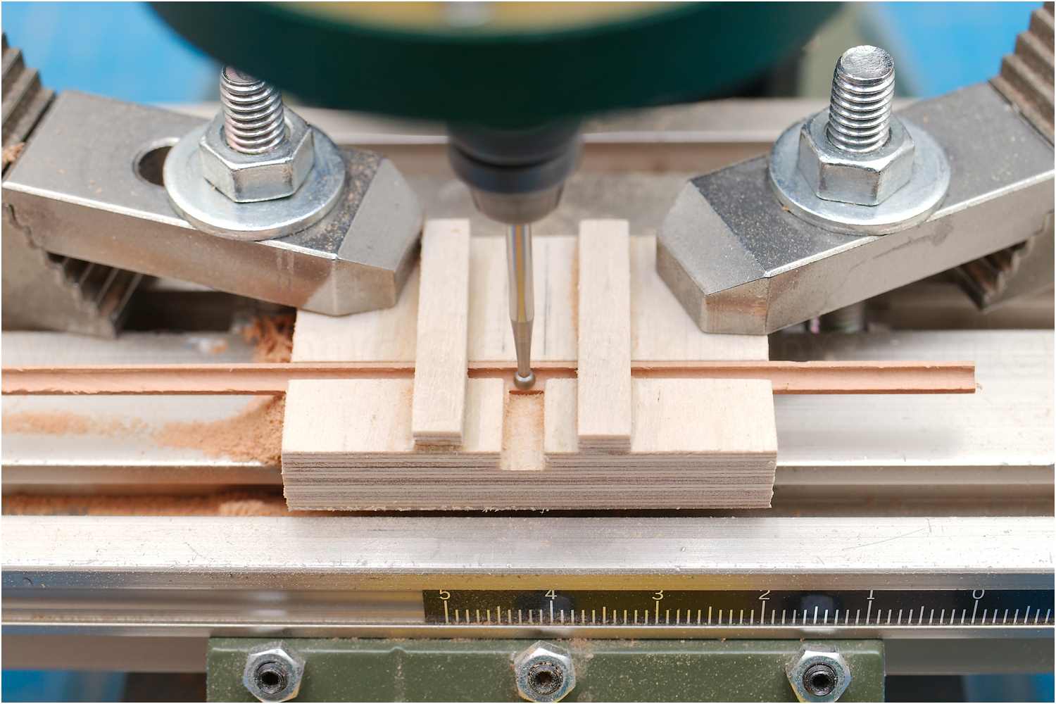 In ein Stück Sperrholz wurde dazu eine Längsnut für die Führung der Leiste gefräst und eine um 90° versetzte Nut für die Zuführung des Fräsers.