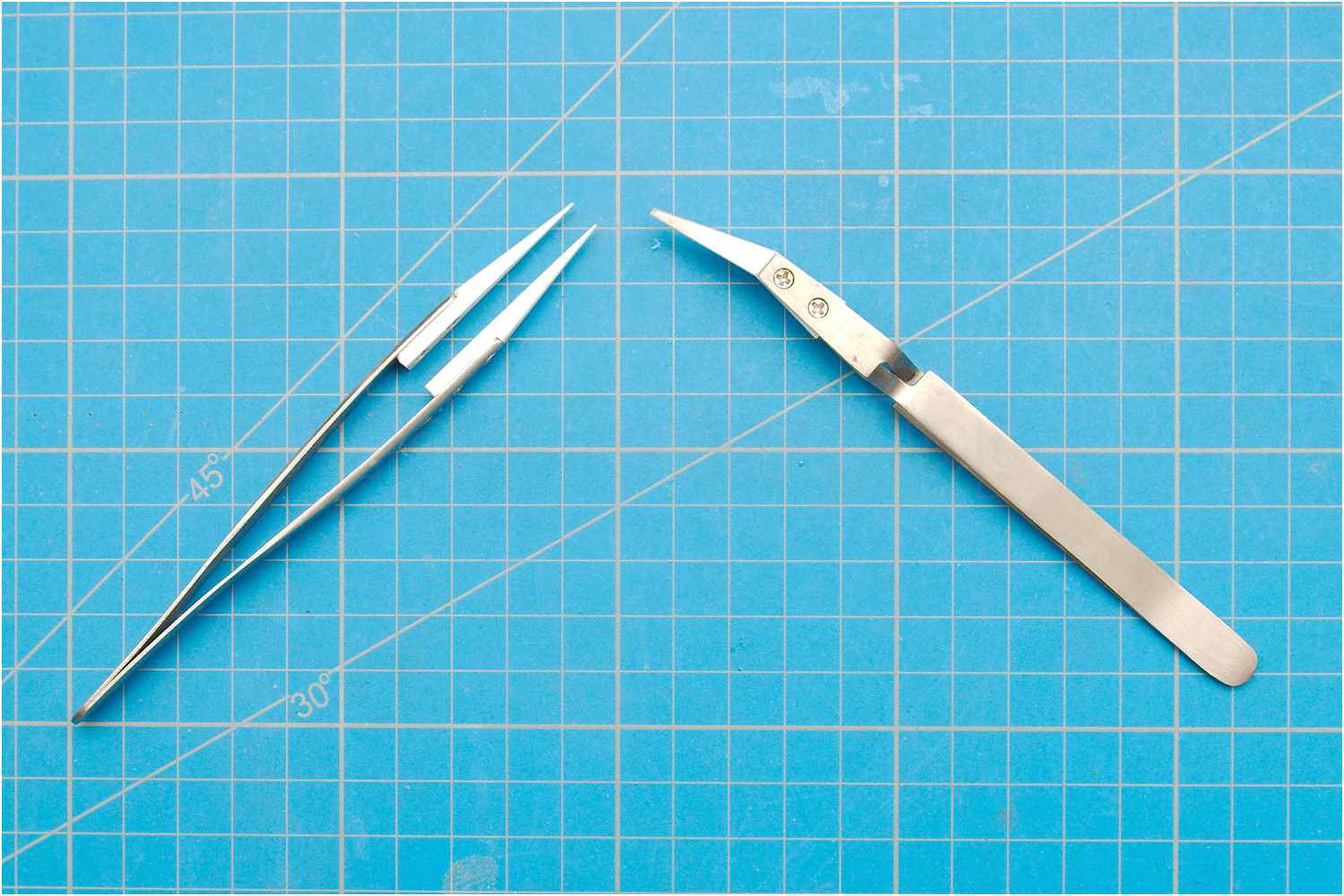 Für Takelarbeiten z.B. sind etwas kleinere, handliche Pinzetten mit schmal zulaufender, filigraner Spitze von Vorteil. Man findet dieses Art mit dem Zusatz ESD (Electrostatic Discharge) in den bekannten Verkaufsportalen.