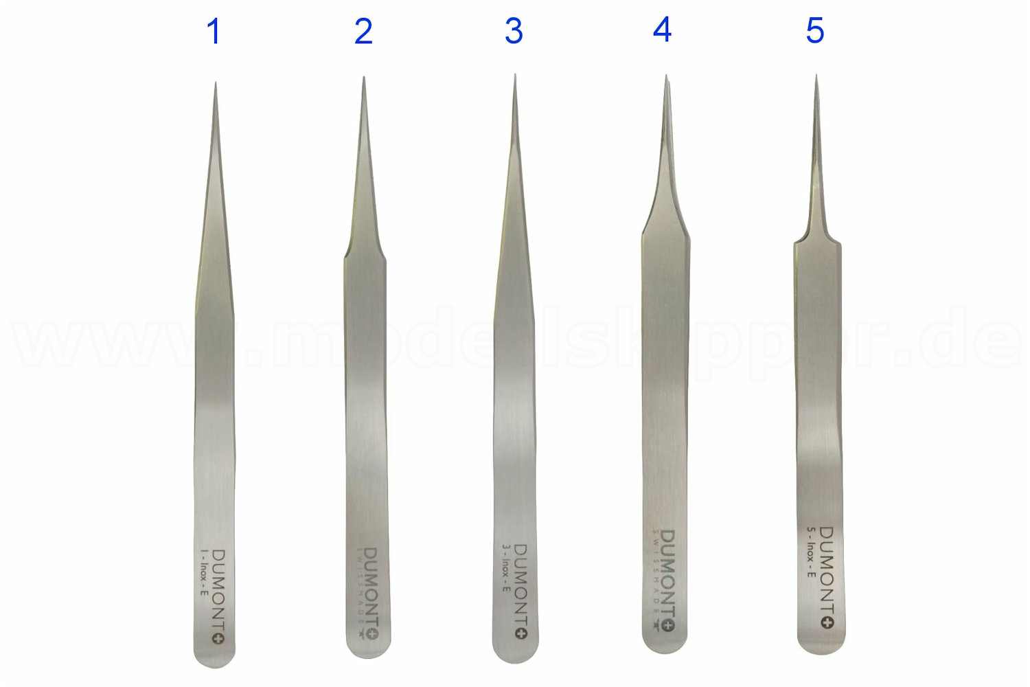 Die einzelnen Spitzenformen sind mit Nummern angegeben. Bei den Firmen Dumont, Rubis, Bernstein und einiger anderer Anbieter sind die Nummerierungen vergleichbar: Nummer 5 ist besonders lang und schmal ausgelegt, etwas moderater Nummer 2 und 4. Die Greifbacken laufen in einem spitzen Winkel zu, bei Nummer 1 und 3 ist der Winkel etwas stumpfer.