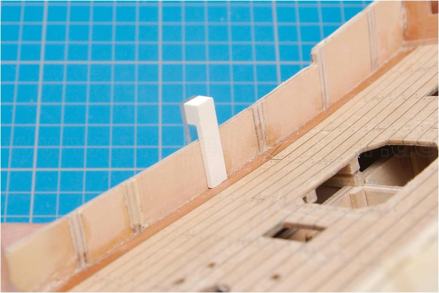 Die Höhe des Schanzkleides ab Deck wird aus dem Bauplan entnommen. Da der Abschluss der Oberkante nach der Beplankung nicht unbedingt eine gerade Linie sein wird, muss an der Innenseite in regelmäßigen Abständen die Höhe vom Deck zu Oberkante gemessen und den Wert abzüglich der Höhe des späteren Schanzkleides auf die Außenseite übertragen werden.