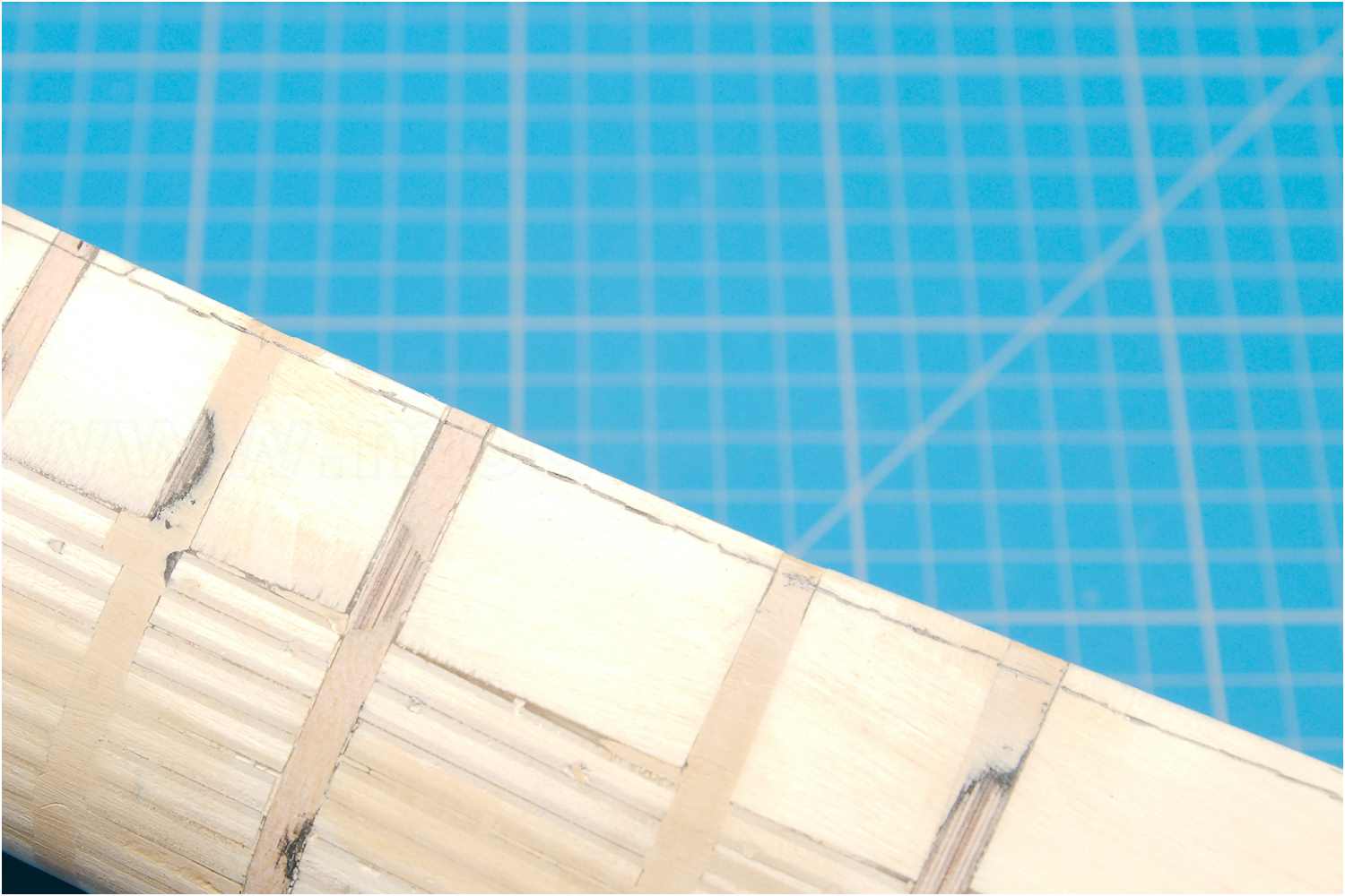 Bei der Erstbeplankung eines Modellrumpfes arbeitet man immer mit etwas Übermaß, das beim späteren Schleifen wieder entfernt wird. Auch bei der Oberkante des Schanzkleides gibt man ausreichend Material zu, um genug Spielraum bei der Endbearbeitung zu haben.