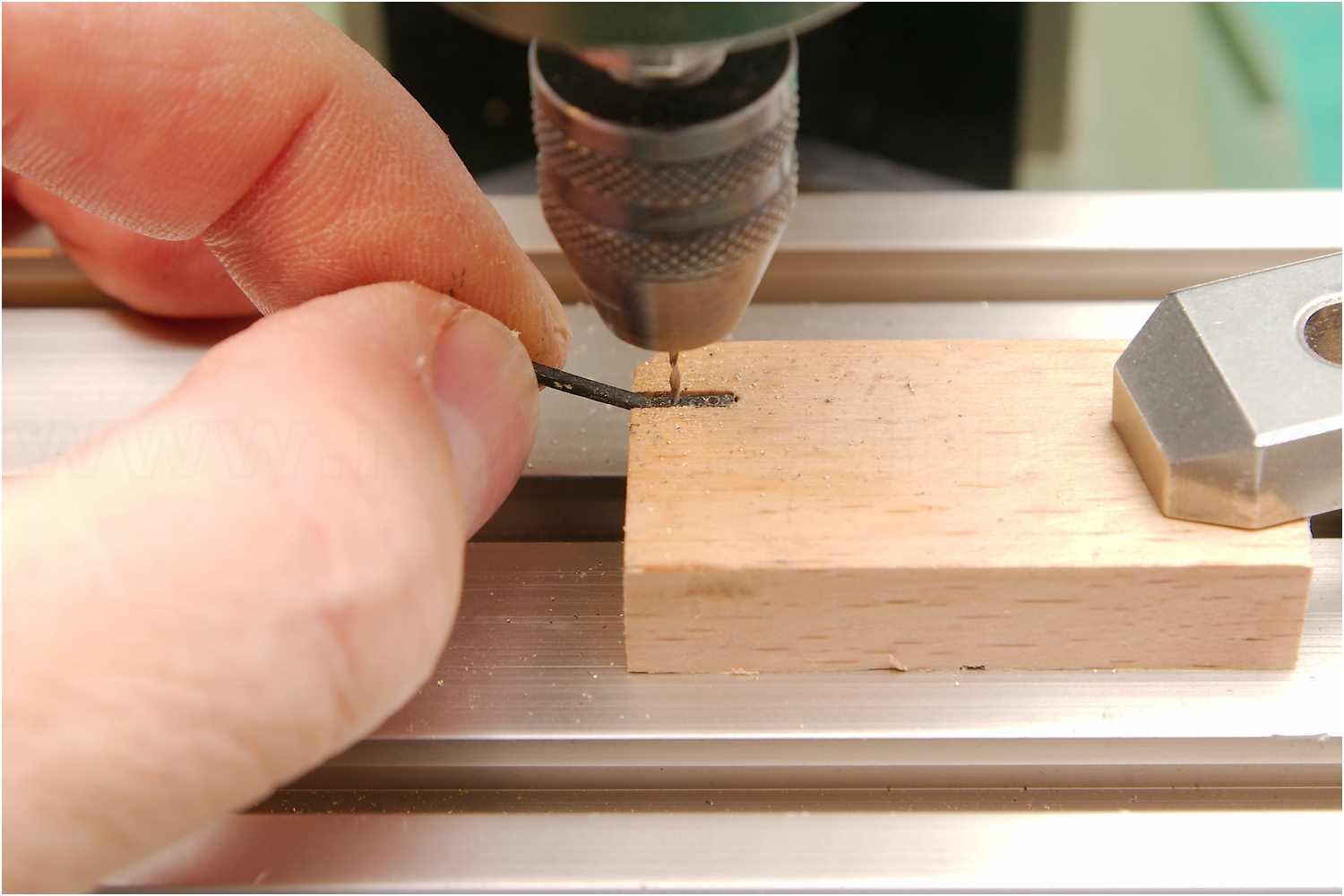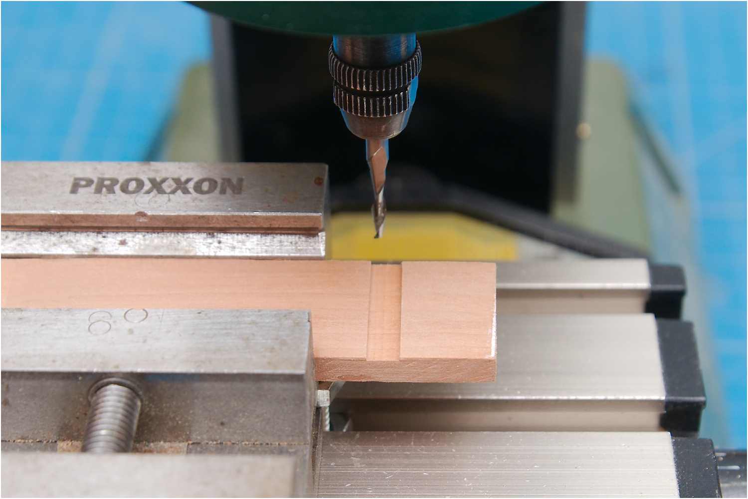 Der in diese Nut eingelegte Streifen ist nun gut fixiert und kann ohne nennenswerten Verzug oder Ausbrechen gebohrt werden.