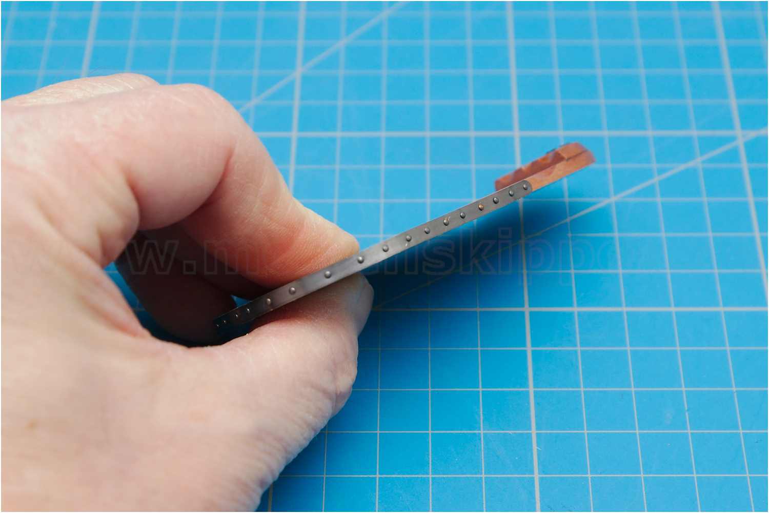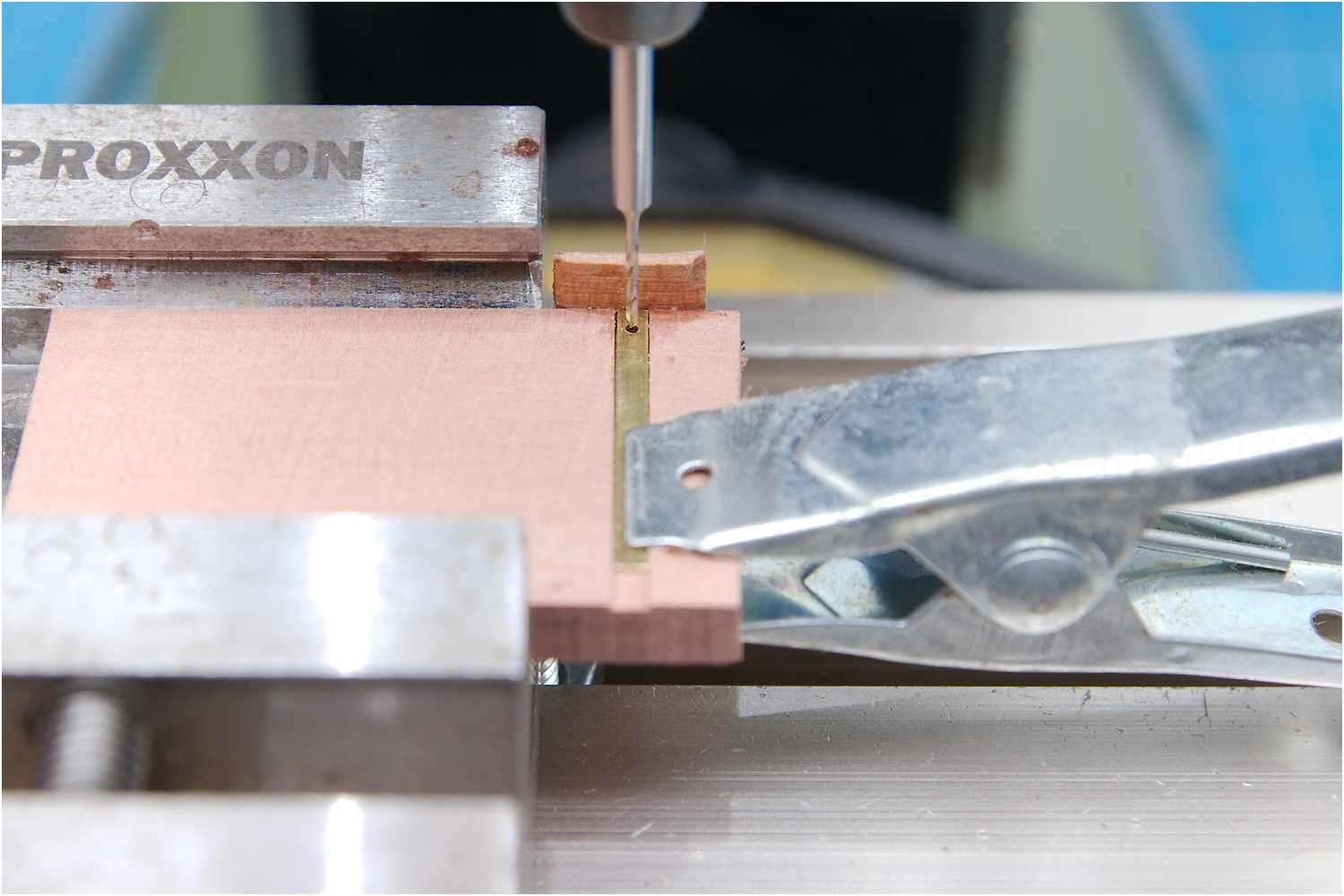 Man fräst in ein Stück Holz, vorzugsweise hartes Holz wie Buche, eine Nut, mit der Breite des Messingstreifens und etwas tiefer als die Materialdicke.