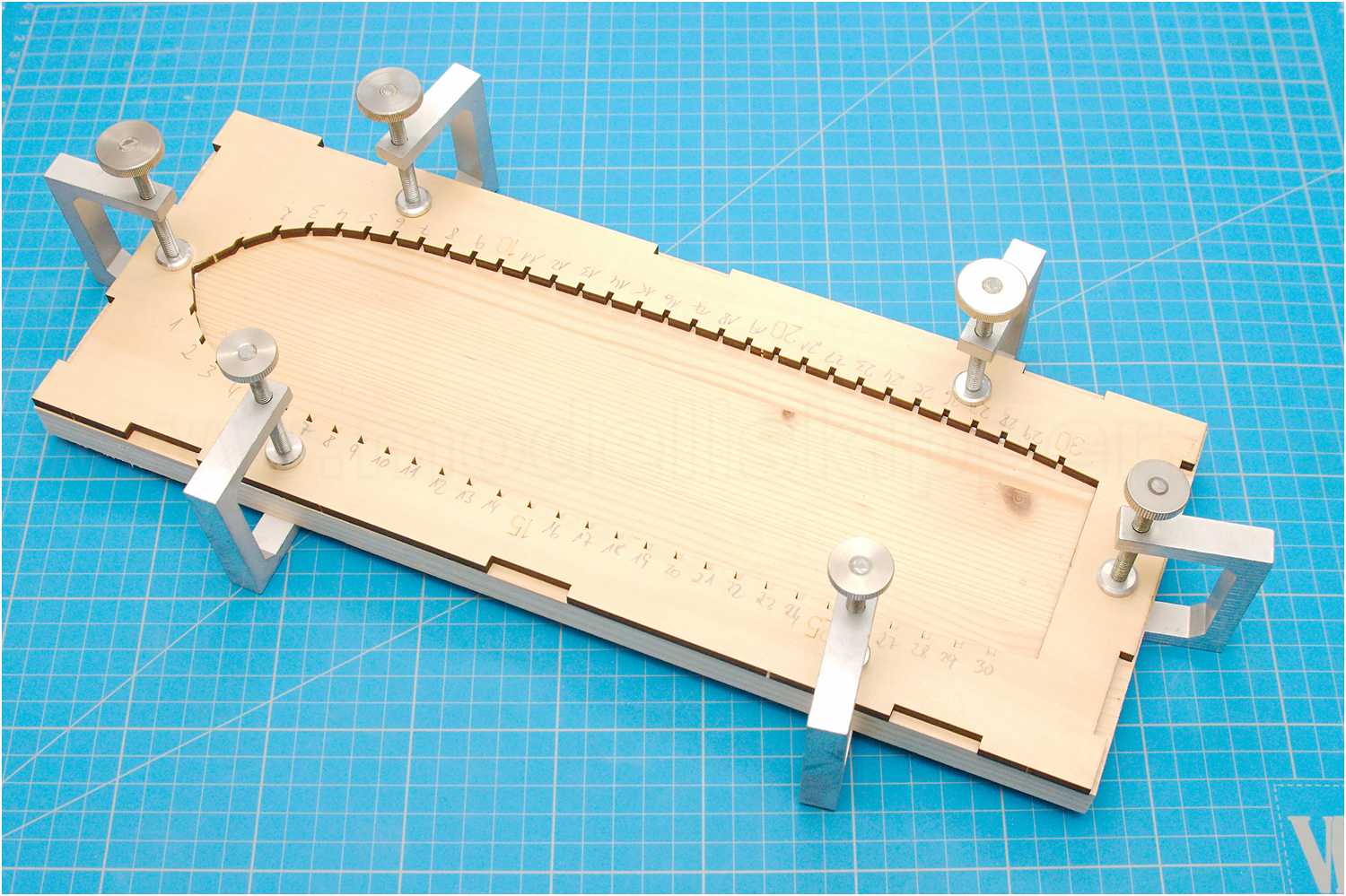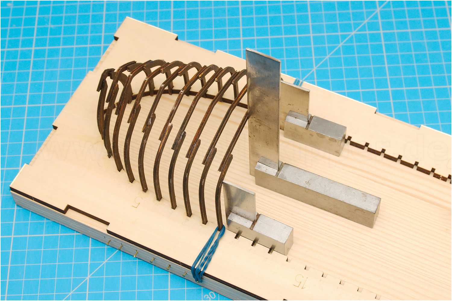 Durch das Zusammenkleben der Spanten auf der Planschablone muss mit kleineren Ungenauigkeiten gerechnet werden, die bei der Beplankung kaum ausgeglichen werden können, da durch die vorgesehenen 0,5-mm-Furnierleisten keine Schleifreserve vorhanden ist.