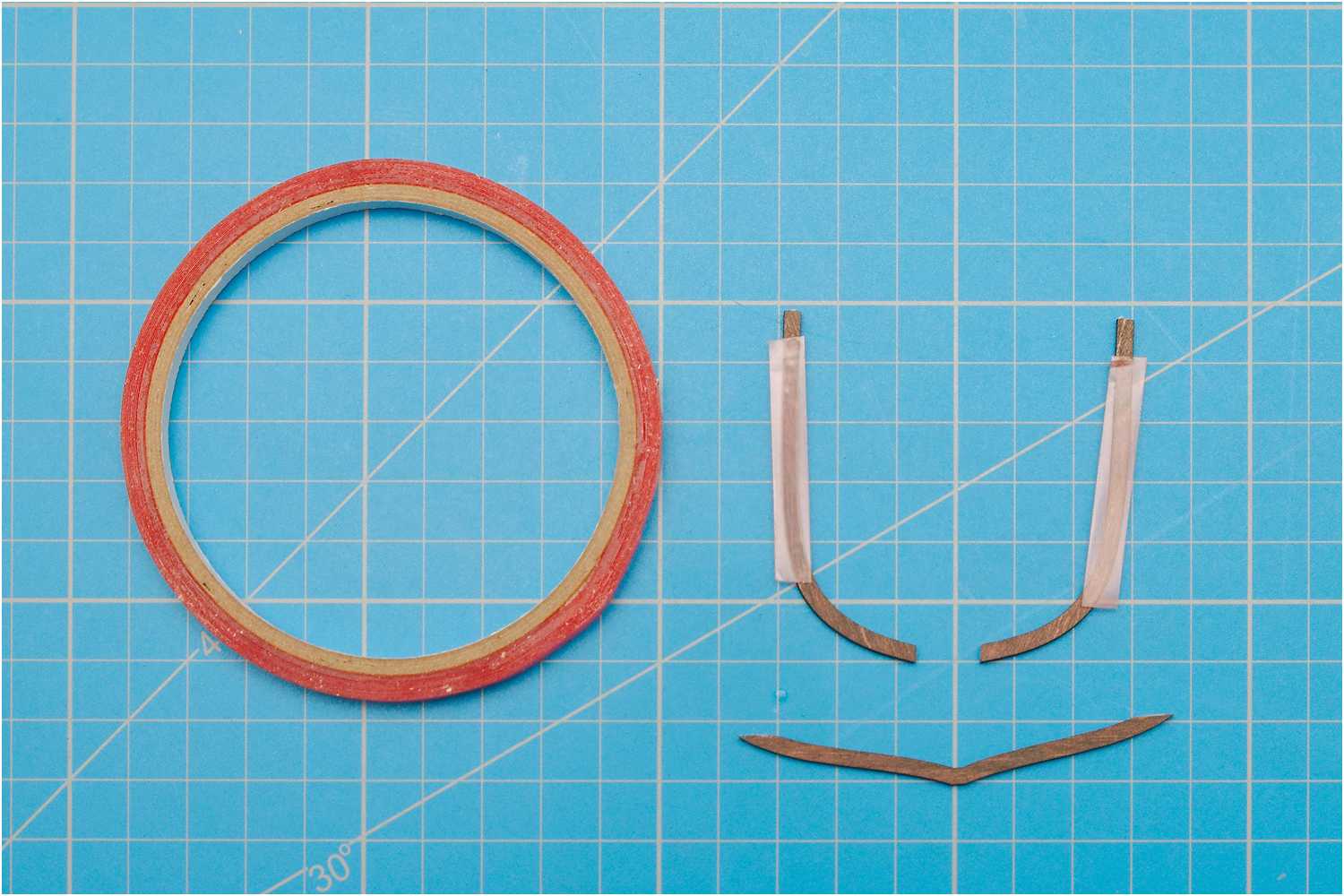Die zwei Seitenteile (Kantspanten) und eine Bodenwrange werden auf die Schablonen geklebt, einfach mit doppelseitigem Klebeband, dass die Papierschablonen später einfach wieder ohne schleifen entfernt werden können.