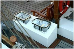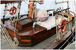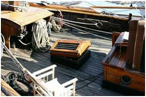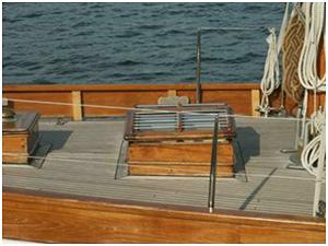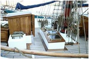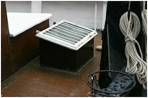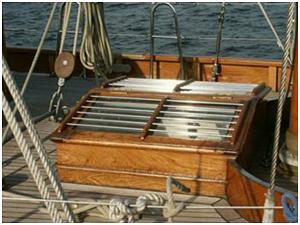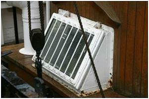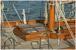eine in das Oberdeck eingebaute, wasserdicht verschließbare Fensterklappe für Tageslicht und Lüftung.