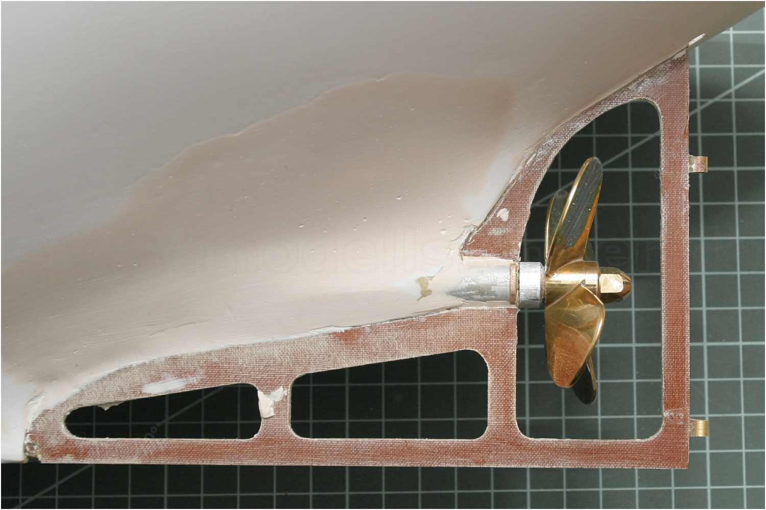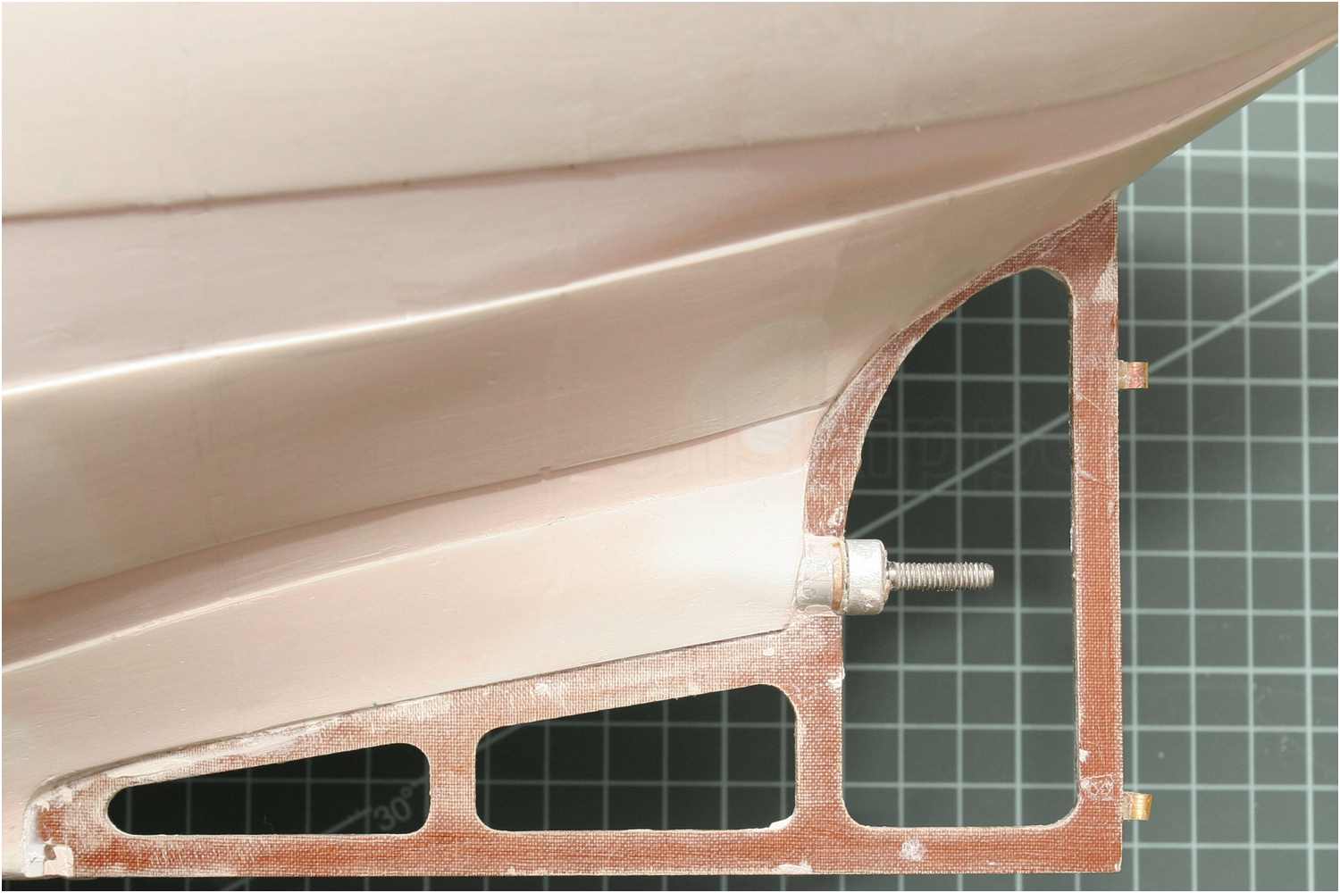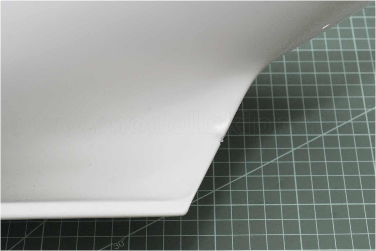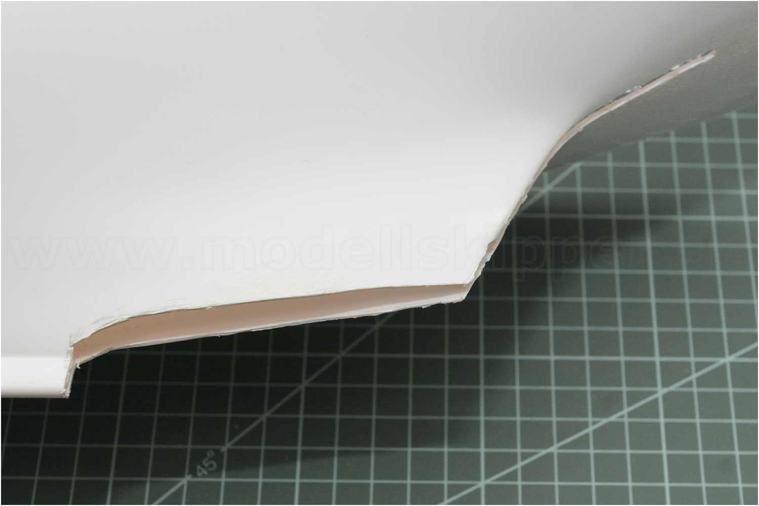 Bedingt durch die Rumpfform war der Spalt der Öffnung des aufgeschnittenen Rumpfbereiches viel zu breit. Durch vorsichtige Erwärmung mit einer Heißluftpistole konnte dieses Manko ausgeglichen und der entsprechende Rumpfabschnitt an den Steven angeformt werden.