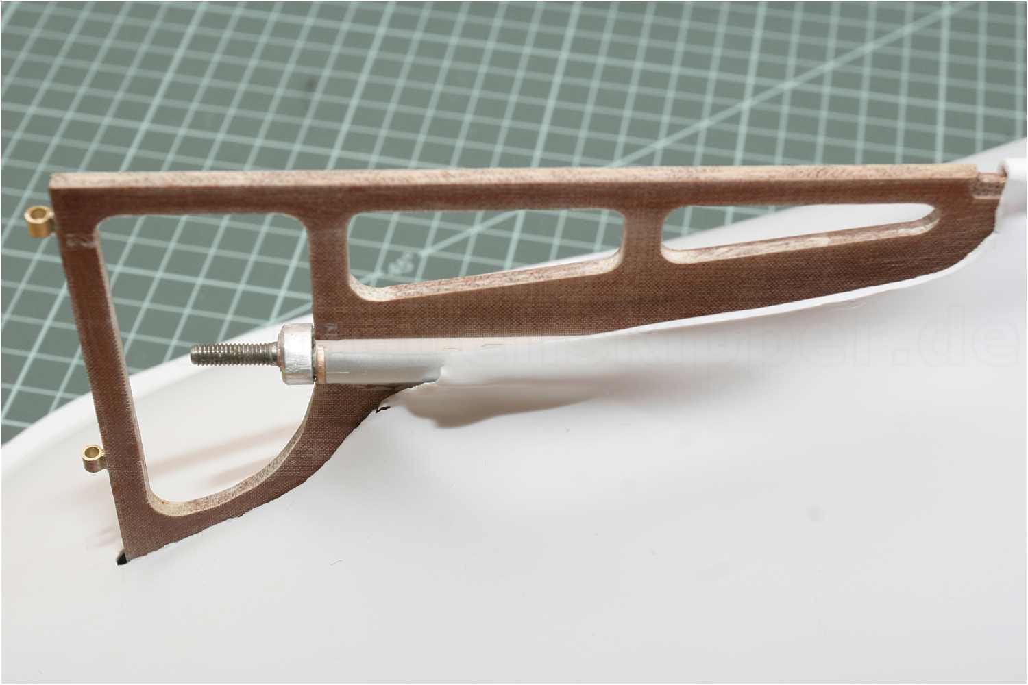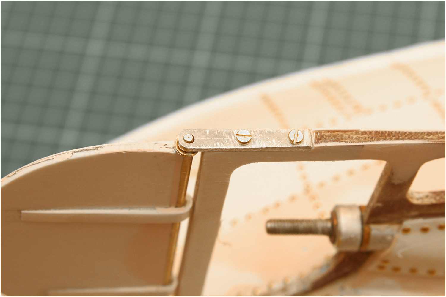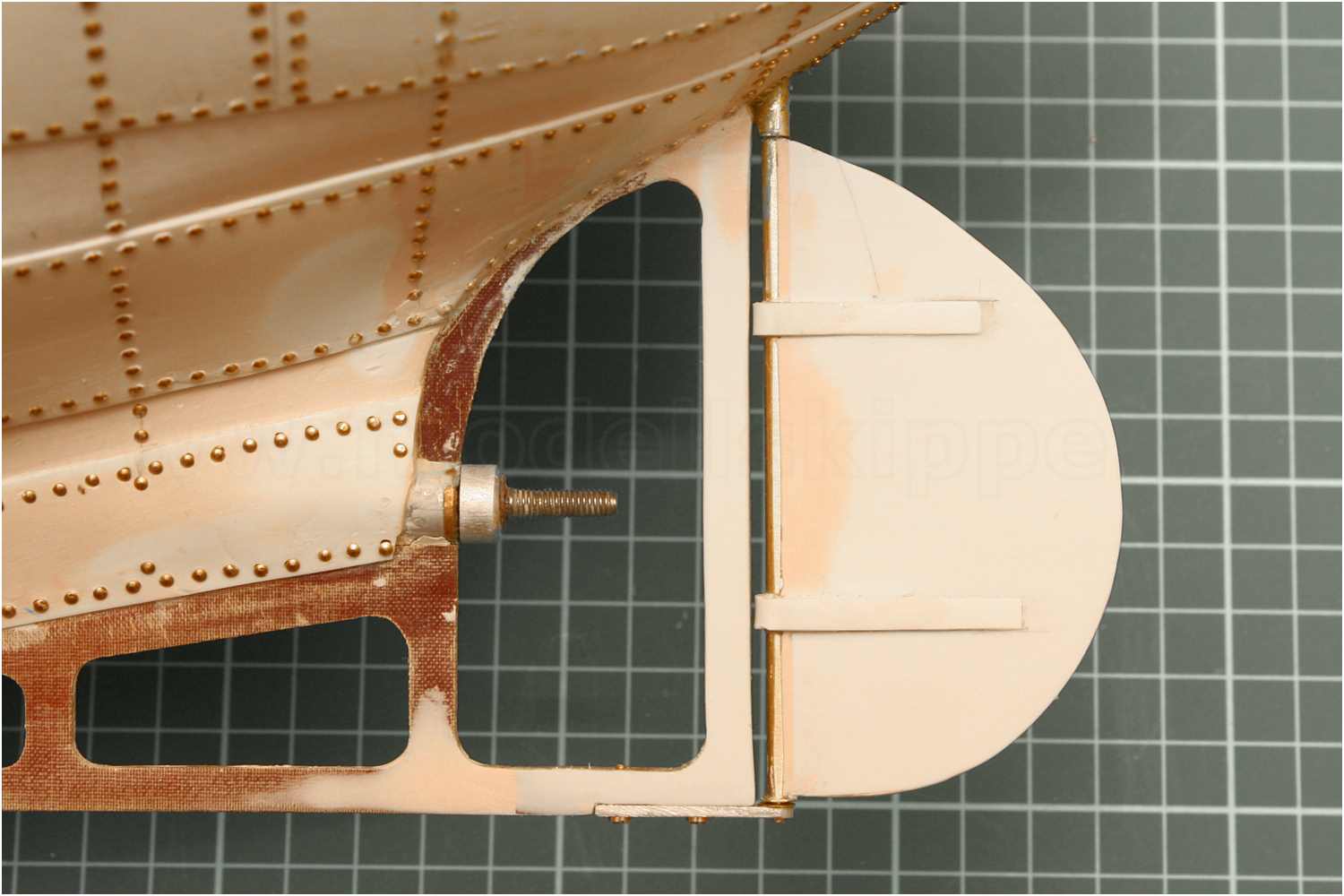 Das eigentliche Ruderblatt besteht aus zwei dünnen Polystyrolplatten. Die imaginären Scharnierbänder überdecken die beiden Messingstifte.