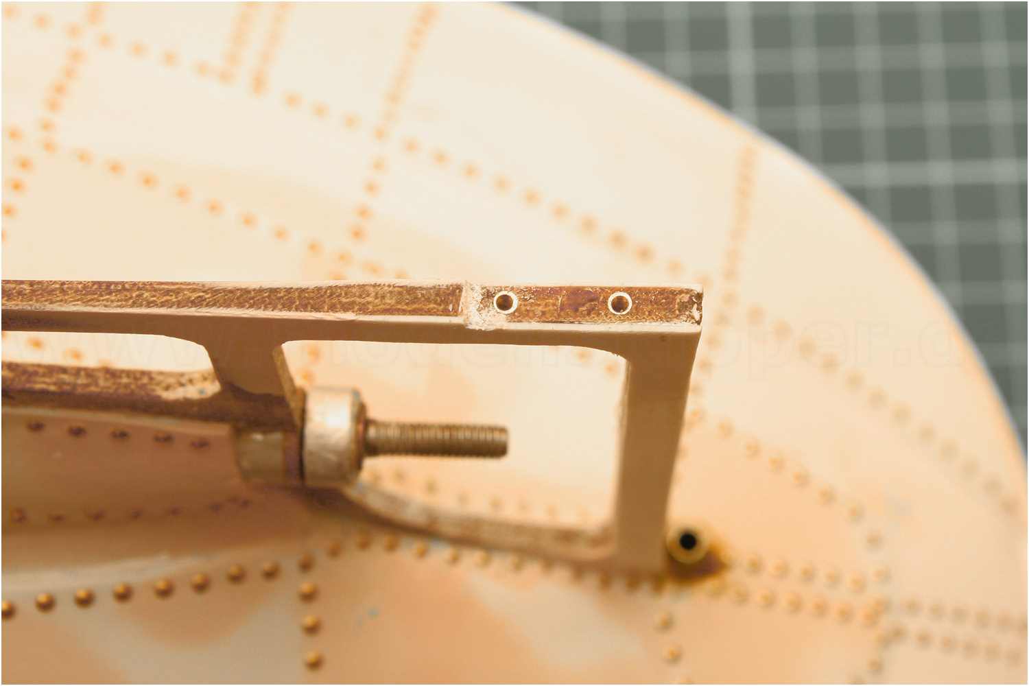Für die Herstellung der Ruderscharniere wurde an ein Messingröhrchen eine Stück Messingblech hart angelötet und in der entsprechend gefrästen Nut im hinteren Teil des Stevens mit Acrylit verklebt.