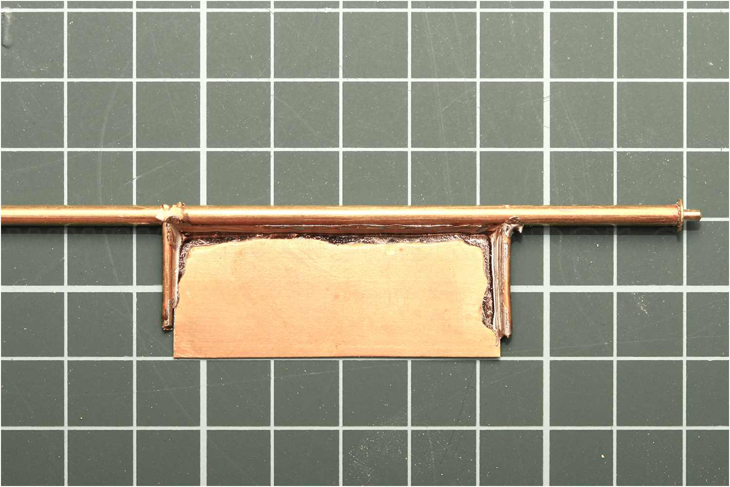 In die Ruderachse wurden zwei Löcher gebohrt, in die jeweils ein Messingstift eingelötet wurde. Diese Stifte übertragen später die Kräfte der Ruderbewegungen auf das Ruderblatt. Für die Befestigung des Ruderblattes an der Ruderachse habe ich noch ein kleines dünnes Blech angelötet, sozusagen als Klebehilfe.