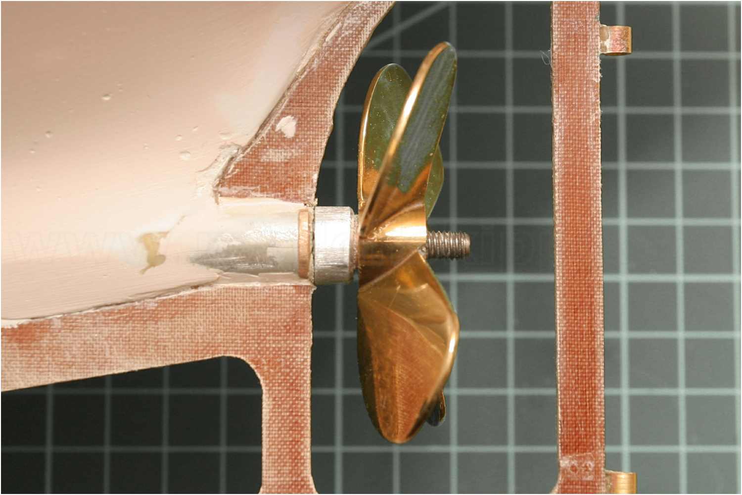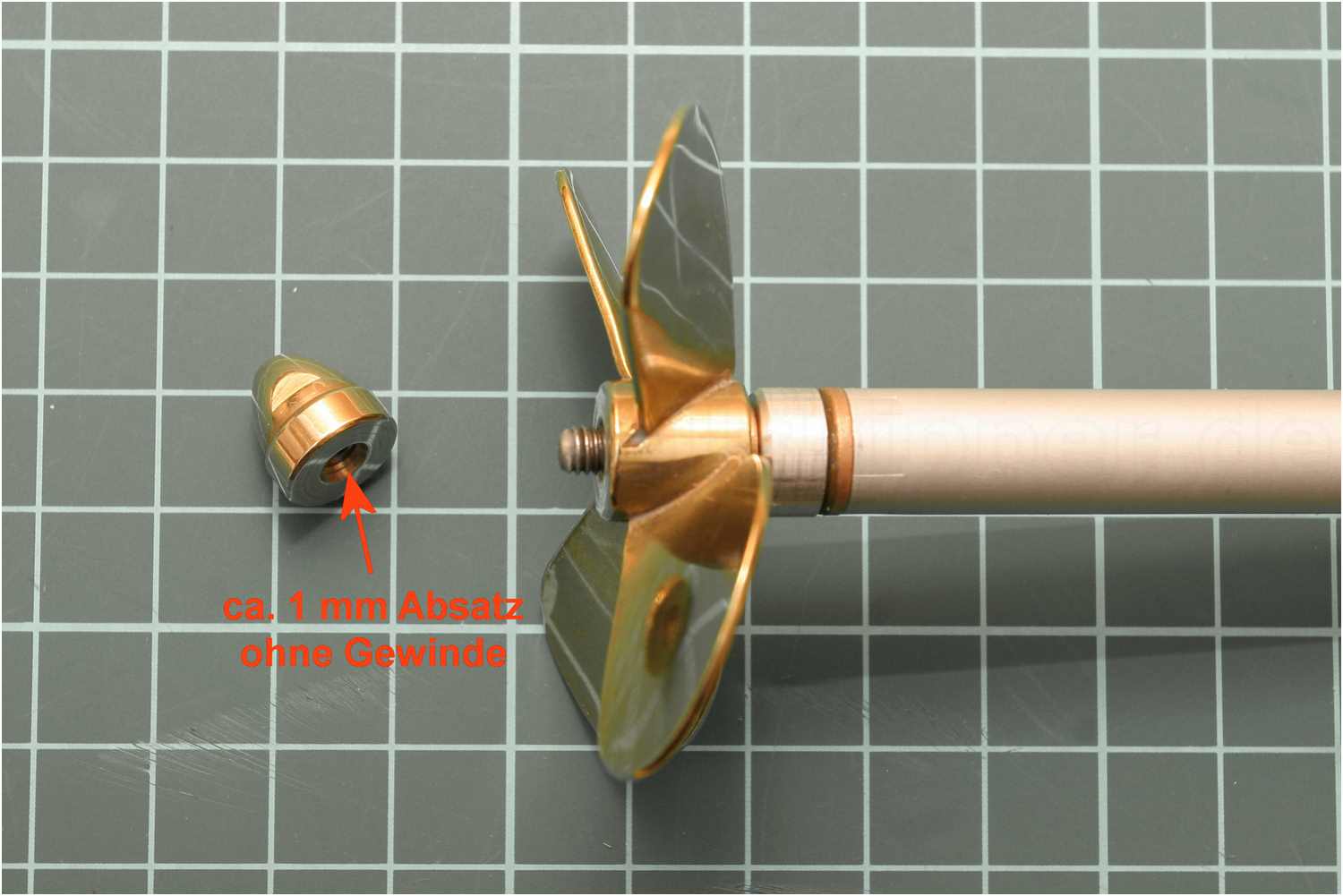 Ansonsten unterscheidet sich die Ausführung nicht groß von den Messingpropellern anderer Hersteller, mit einem kleinen Unterschied: dieser Propeller hat eine separate Nabenspitze mit Gewinde, die die sonst übliche Kontermutter ersetzt. Hier traten allerdings zwei Probleme auf: