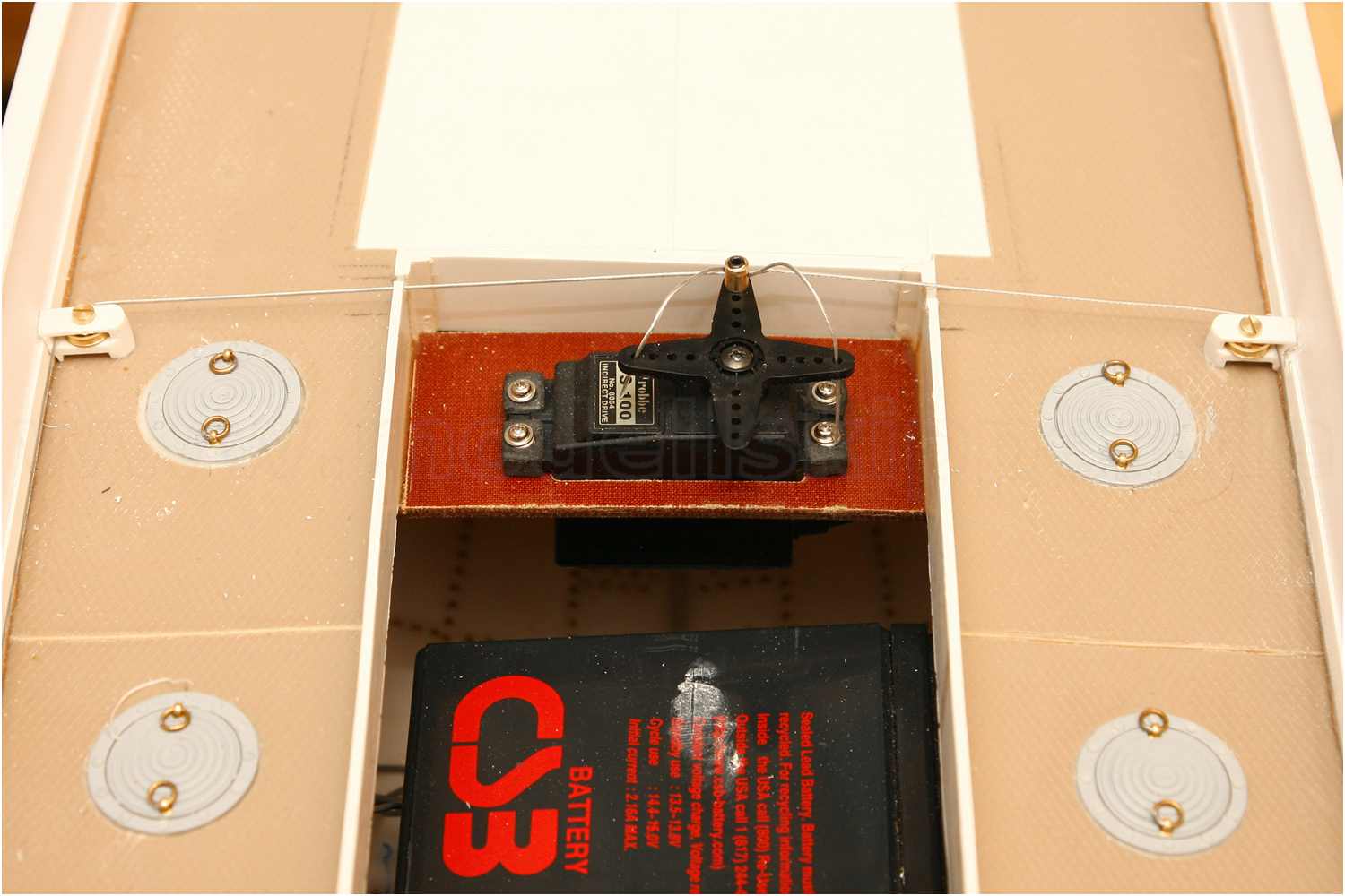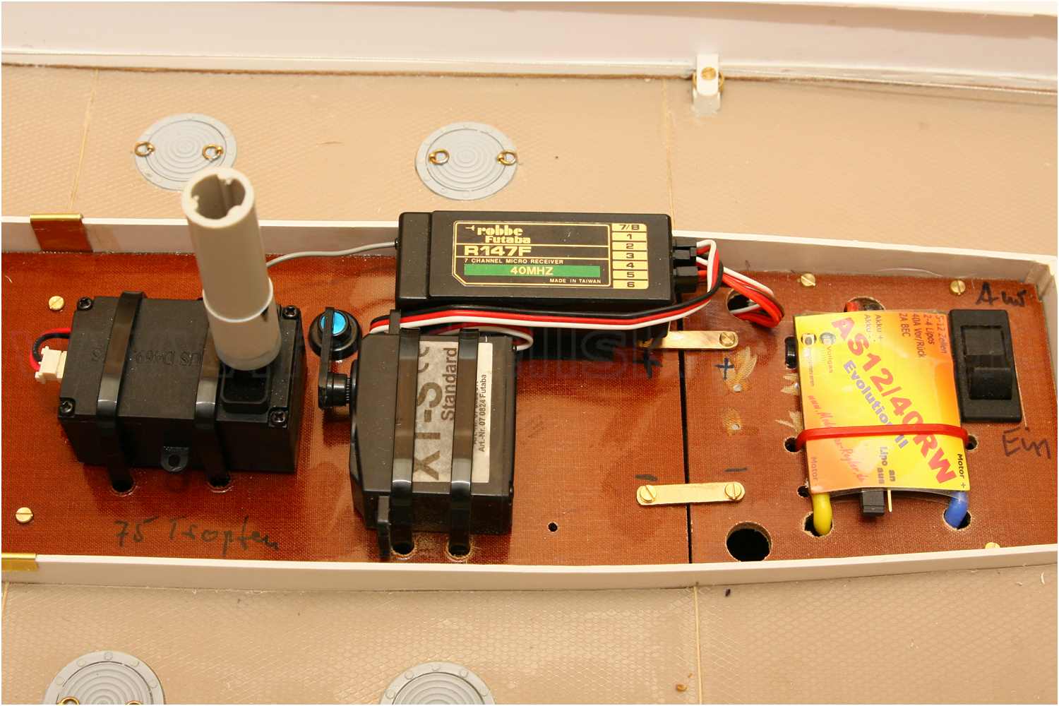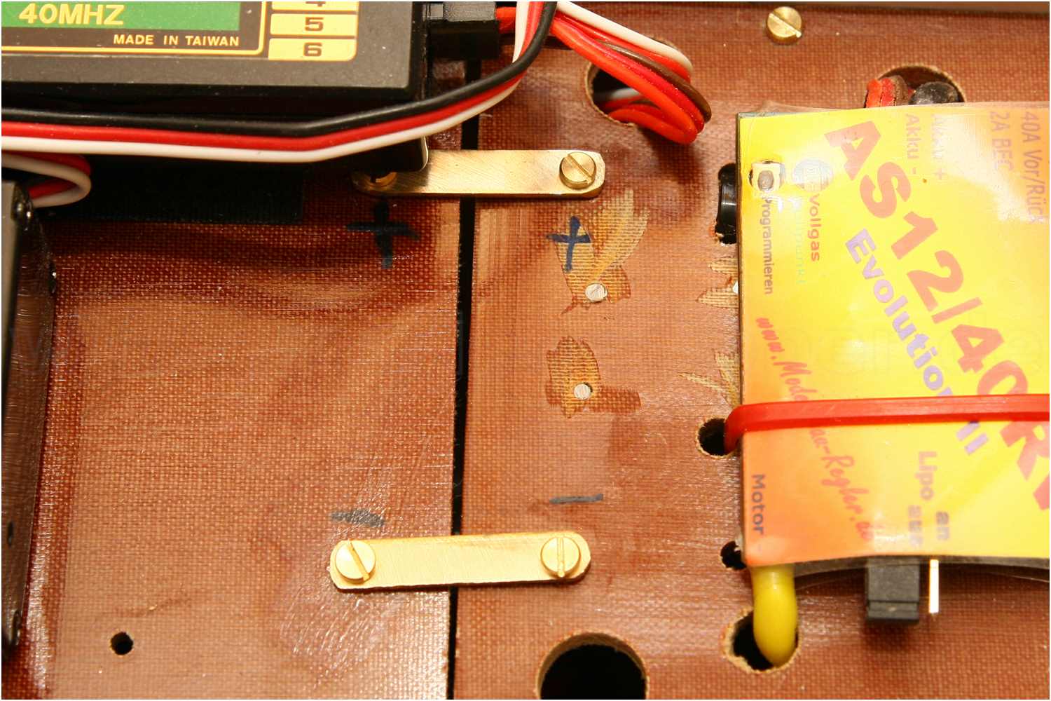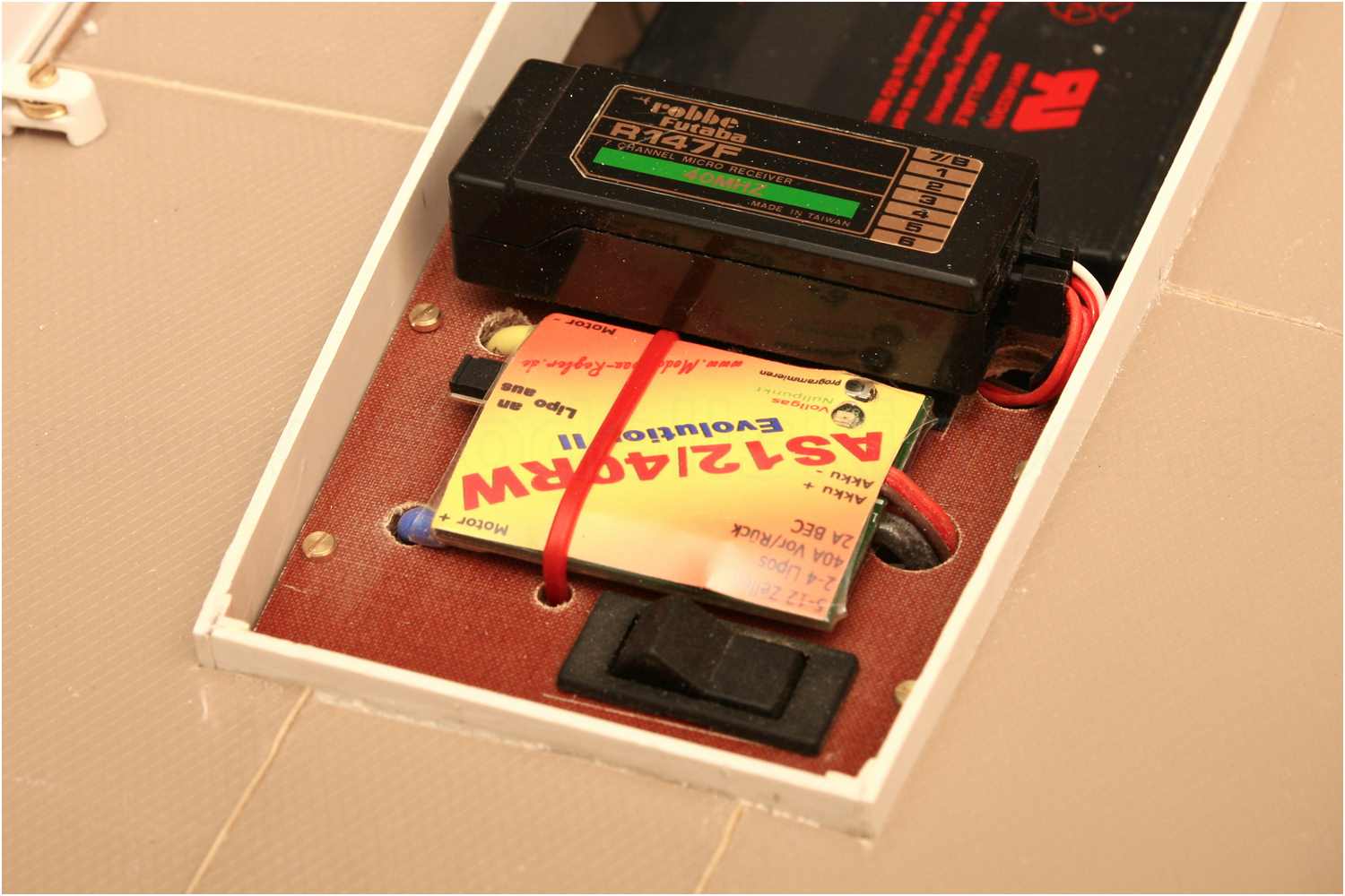 Unter dem achteren Aufbau ist die RC-Platte mit Hauptschalter und Fahrtregler untergebracht. Der Regler ist mit einem Kabelbinder fixiert.