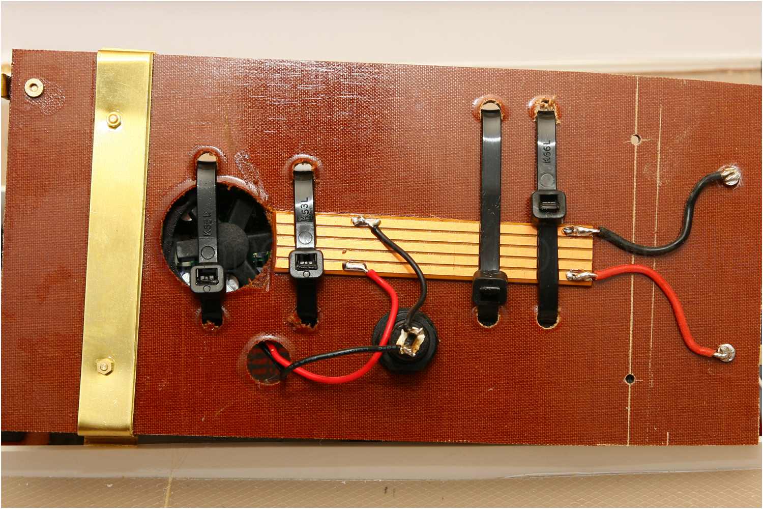 Hier verwende ich Gewindehülsen, an deren Unterseite zwei Kabel vom Hauptschalter angelötet sind und über die Messingbrücke die Geräteplatine mit Spannung versorgen.