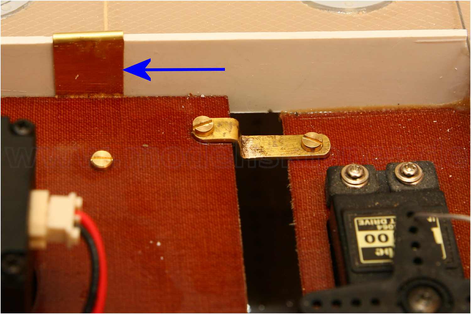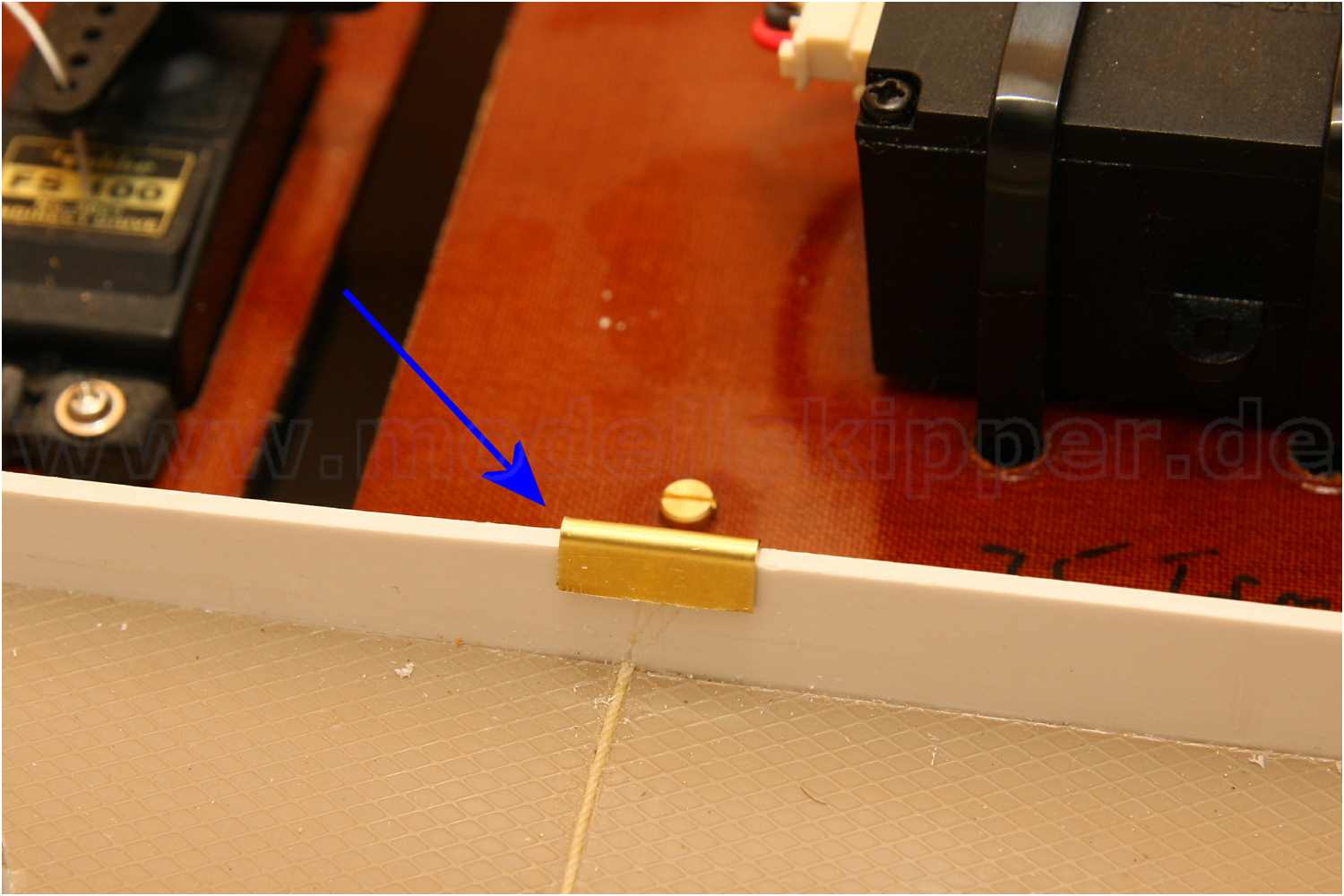 Die Geräteplatine wird am vorderen Ende jeweils links und rechts durch einen Messingbügel gehalten (blauer Pfeil),...... der auf dem Süll der Decksöffnung aufliegt.