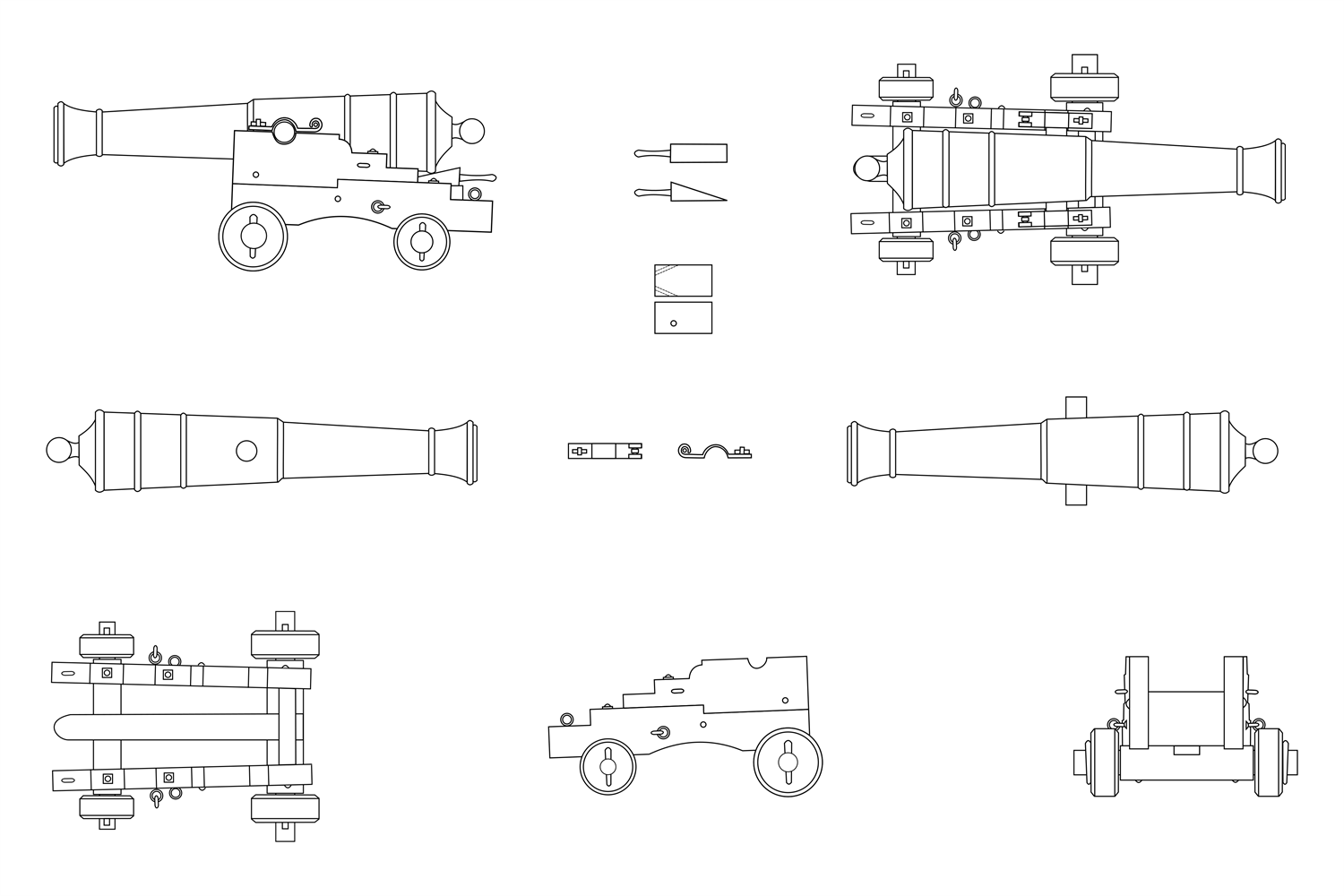 Den Plan für die 65-mm-Messingrohre habe ich als englischen 3-Pfünder aus der zweiten Hälfte des 18. Jhd., passend zu den Angaben zu den Rohrlängen in SB, im Maßstab von 1:30 gezeichnet.