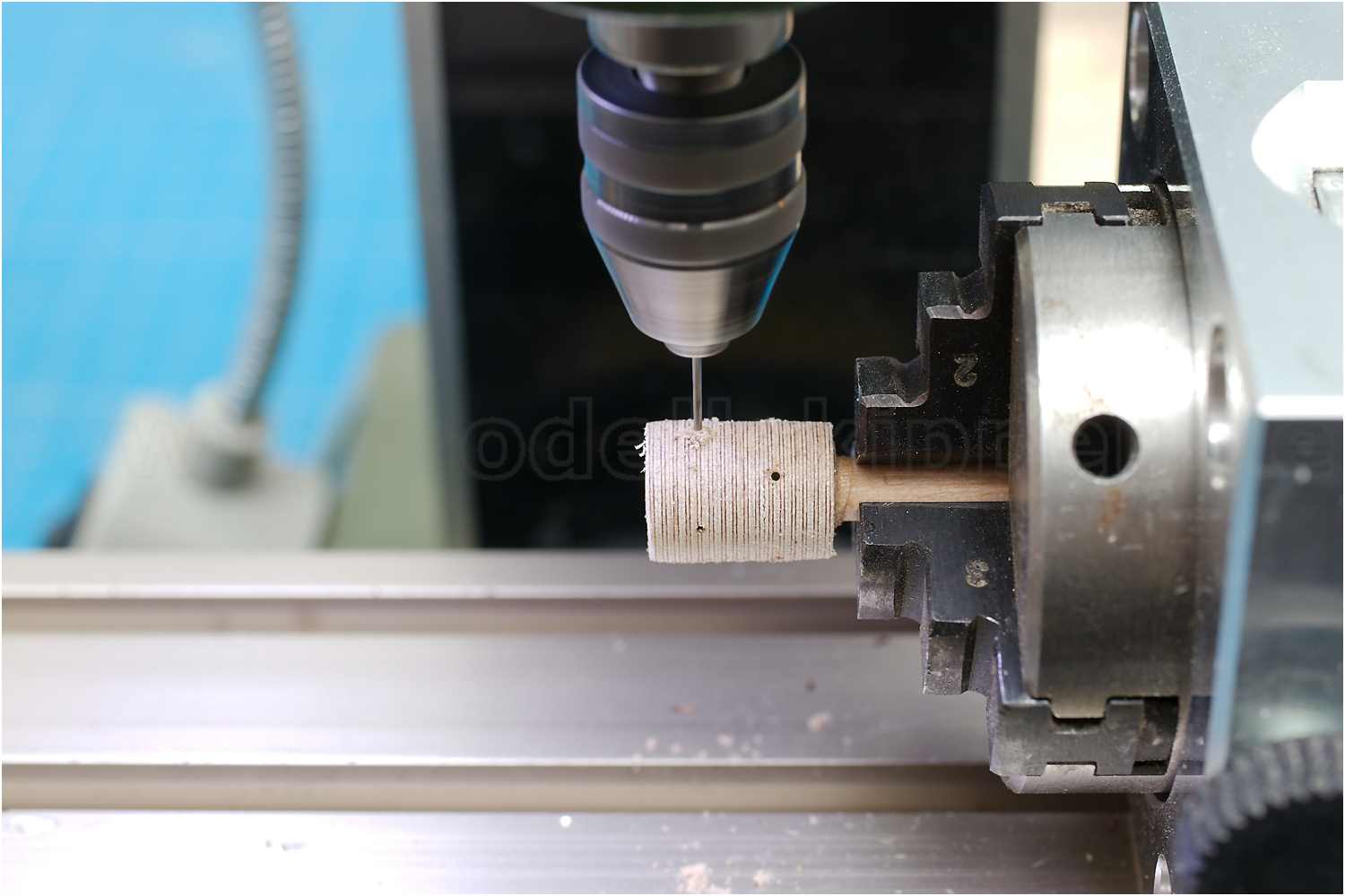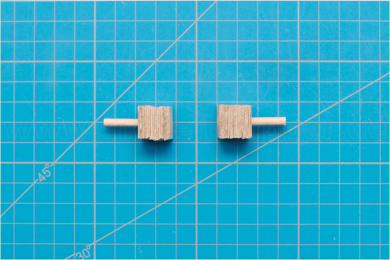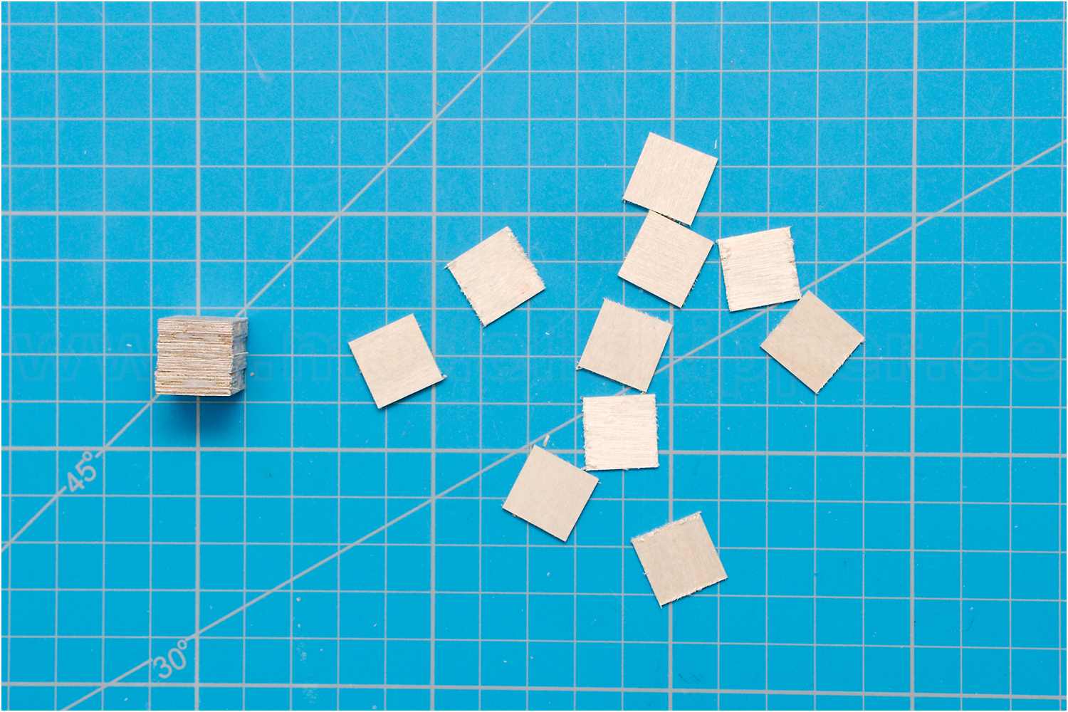 Dafür schneide in mir kleine quadratischen Platten aus 0,8 mm Sperrholz zu, verklebe diese zu einem Quader und setzen ein Rundholz zum Einspannen in die Drechselmaschine.