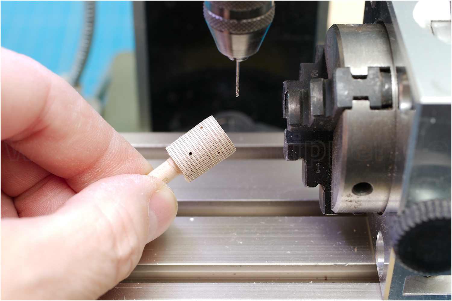 Dafür habe ich in den Korpus zwei Reihen je vier Löcher mit einem Versatz von 45° gebohrt.