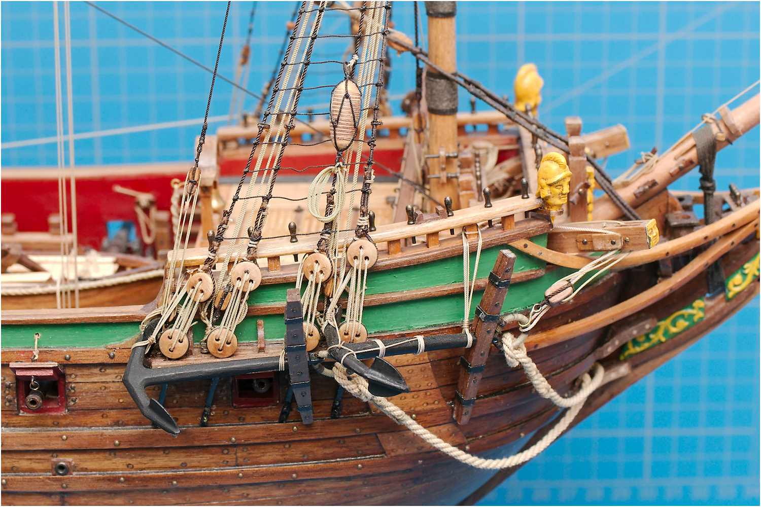 In die Löcher wurden dann jeweils zwei Taue so eingeklebt, dass ich zwei Schlaufen erhalte und das Bojenreep im Zickzack unter die jeweils eingeklebten Enden der Schlaufen führen konnte.