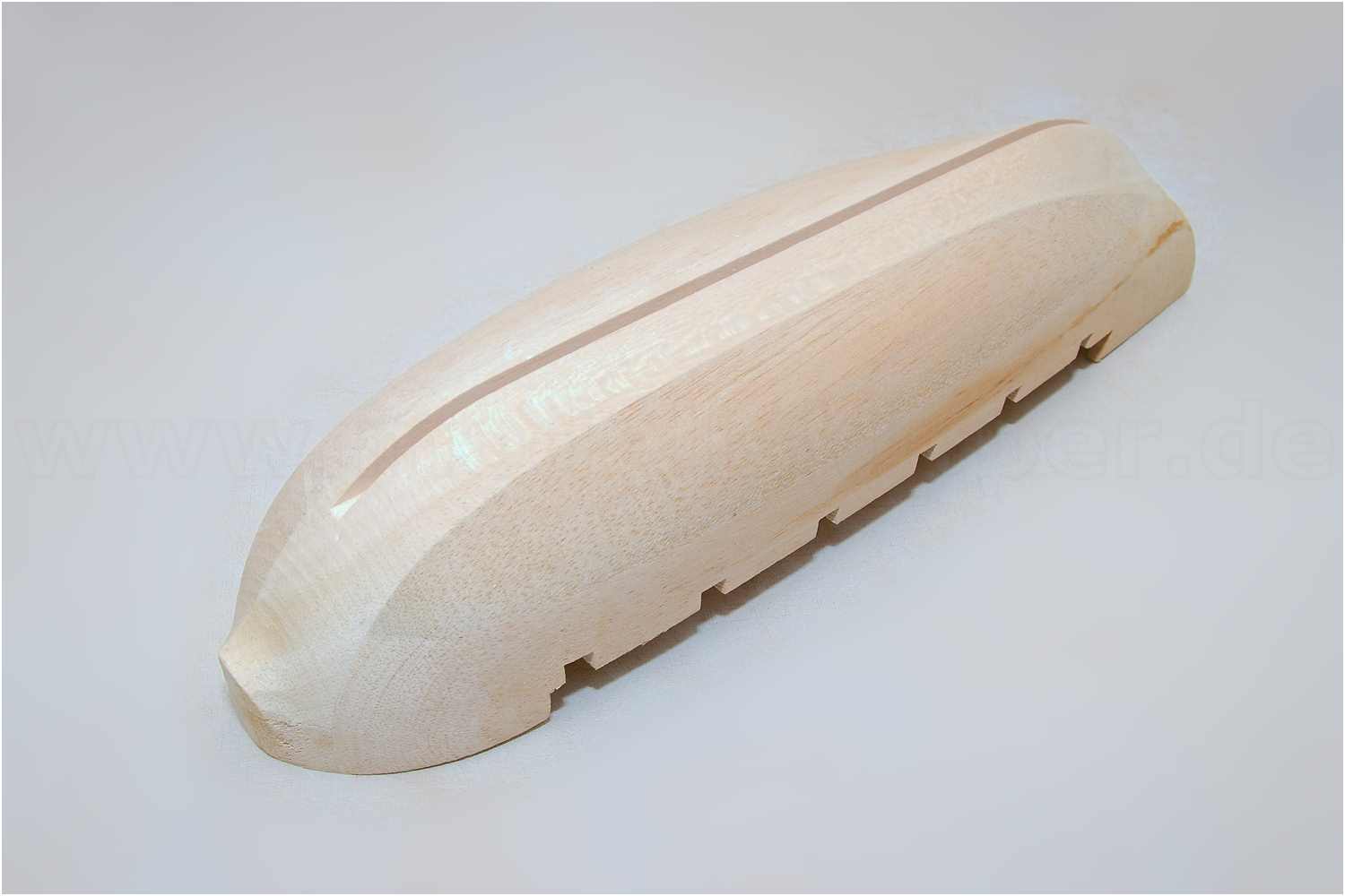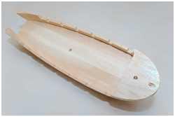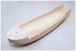 Der Rumpf ist aus Balsaholz gefräst. Mit angeformten Backdeck, Kielnut und Öffnungen der späteren Stückpforten erspart es mir das Aussägen der Mallen und Bau einer Helling.