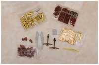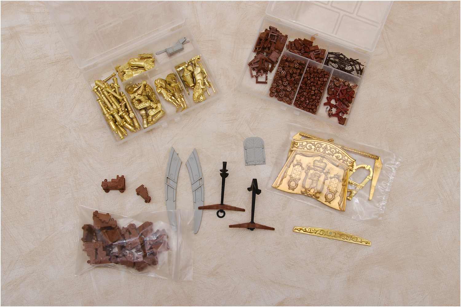 Kanonen und Lafetten in jeweils zwei Größen und die dazugehörenden Stückpforten. Diverse Schmuckelemente und Figuren für die Verzierungen und das große Wappen für den Heckspiegel. Anker, Tür, Kreuzhölzer, Klampen und Belegnägel - alles Plastik. Die Rackkugeln sind durchsichtige Kunststoffperlen, reichlich Juffern und Blöcke, aber jeweils nur in einer einzigen Größe. Noch ein paar Messingnägel, Augbolzen und Ringe - ebenfalls aus Messing. Das wird wohl nicht ausreichen.