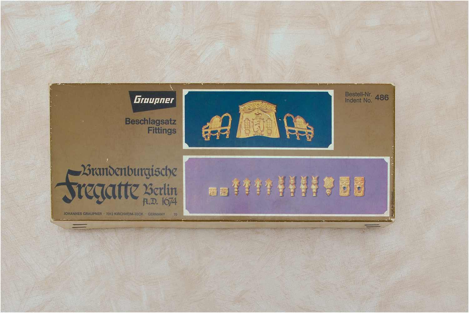 Der Baukasten mit den Zeichen seines Alters. Arg abgegriffen wurde er wohl über die Jahrzehnte immer wieder von hier nach dort gestellt oder ist, wer weiß wie oft, vom Keller auf den Dachboden und zurück umgezogen, aber wohl nie eine Modellbauwerft von innen gesehen. Beigefügt war ein alter Graupner-Katalog aus dem Jahren 1970.