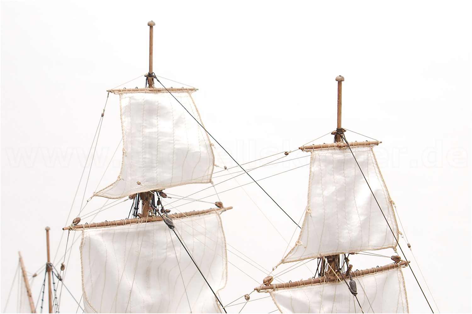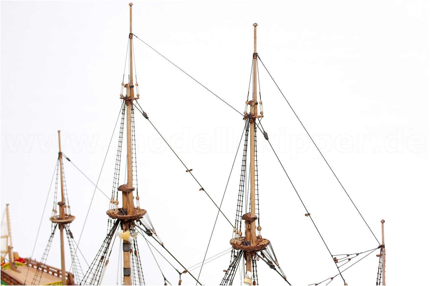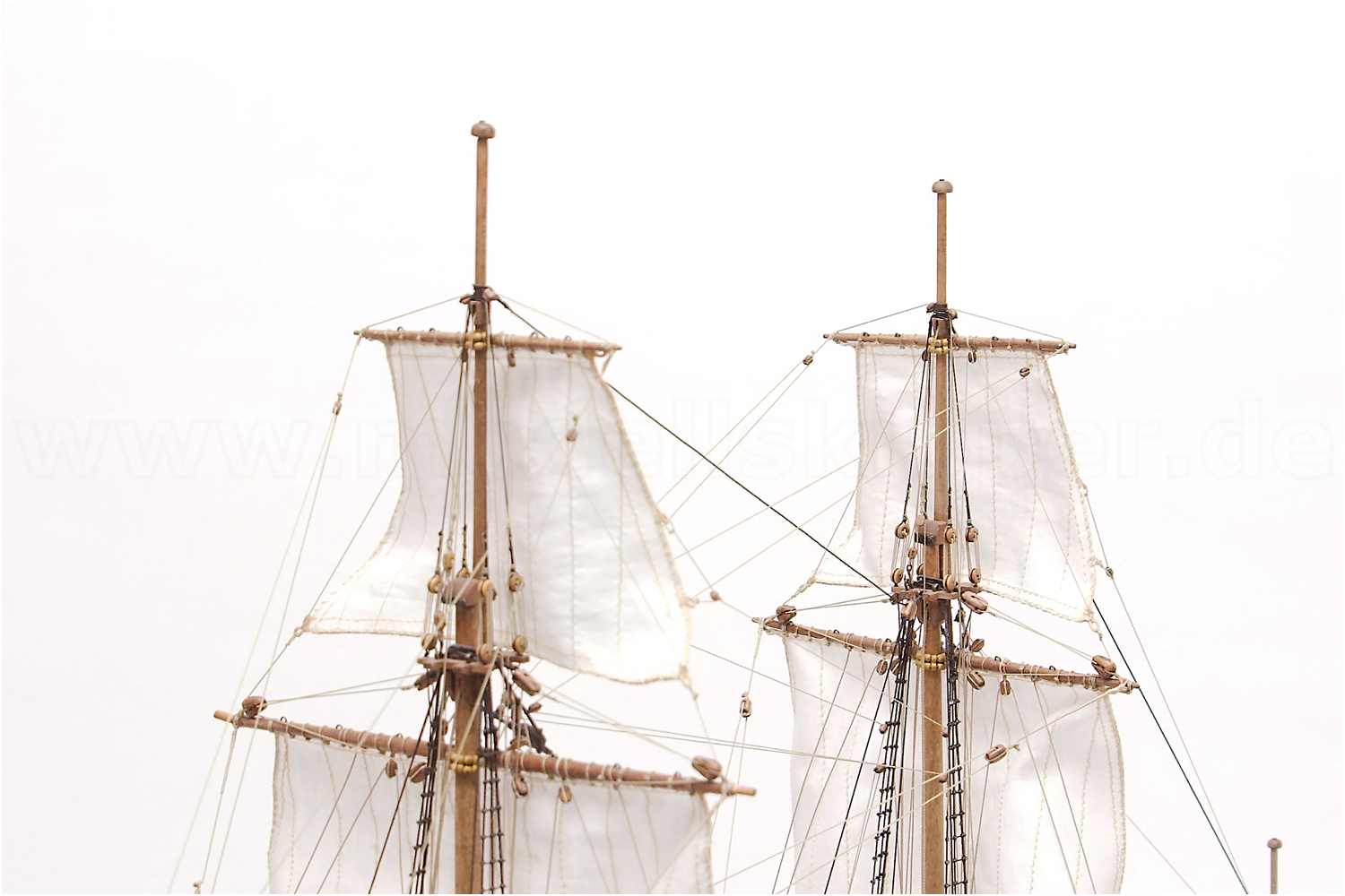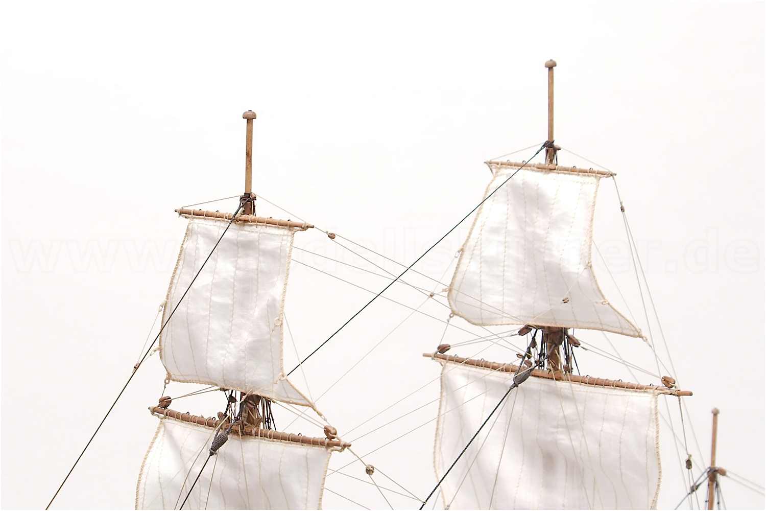 Schenkel: bei AN 184 (247) zeigt Schenkel, ebenso am Modell der William Rex, Länge 0,4 der Rahlänge, bekleidetes Auge an der Rahnock, durch den Blockstropp mit Stopperknoten am Ende Läufer: feste Part kommt vom Großbramstag, fest über seinem Stagleitblock, läuft zum Schenkelblock an der Rah, zurück zum Stagleitblock zum Leitblock an hinterer Fockmarswant, über Leitkausch, fest Bb/Stb an Reling Backdeck Quellen: PW 90 (6), MS 84 |