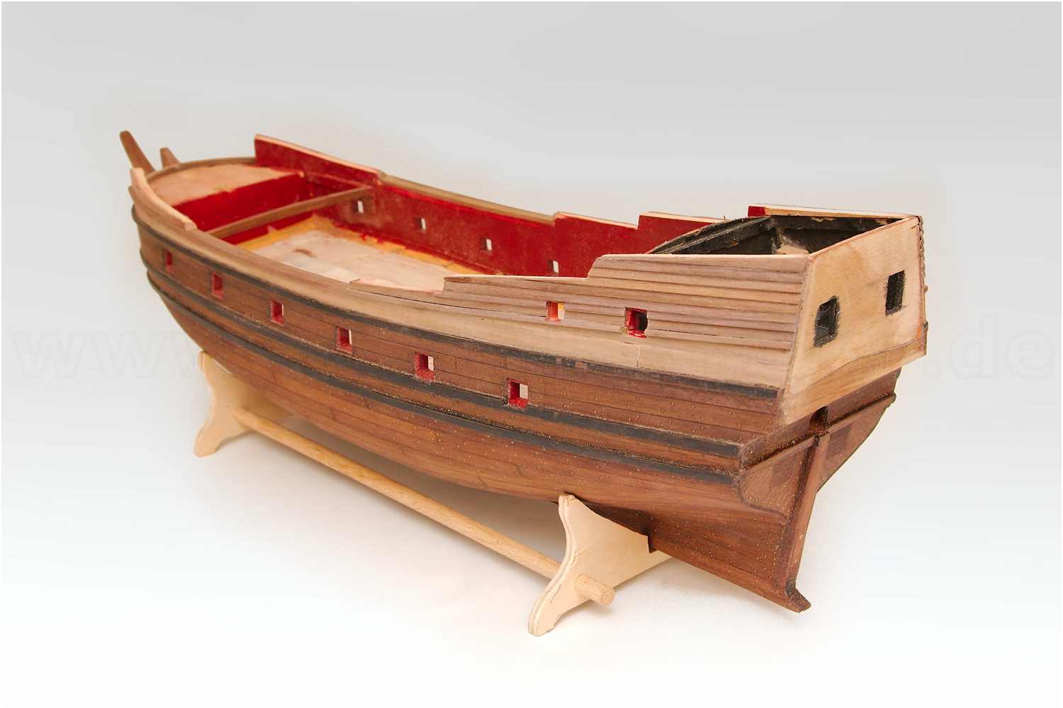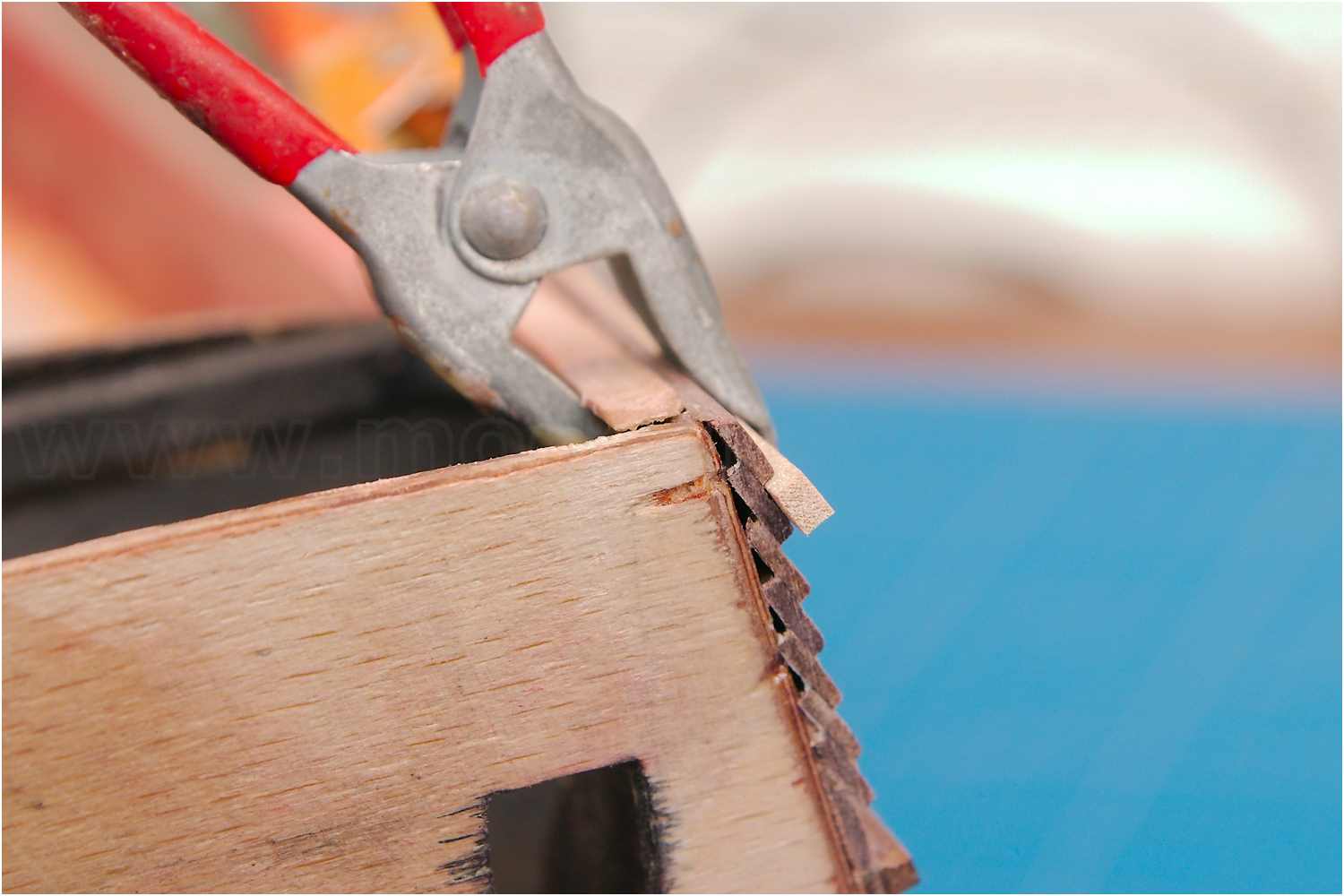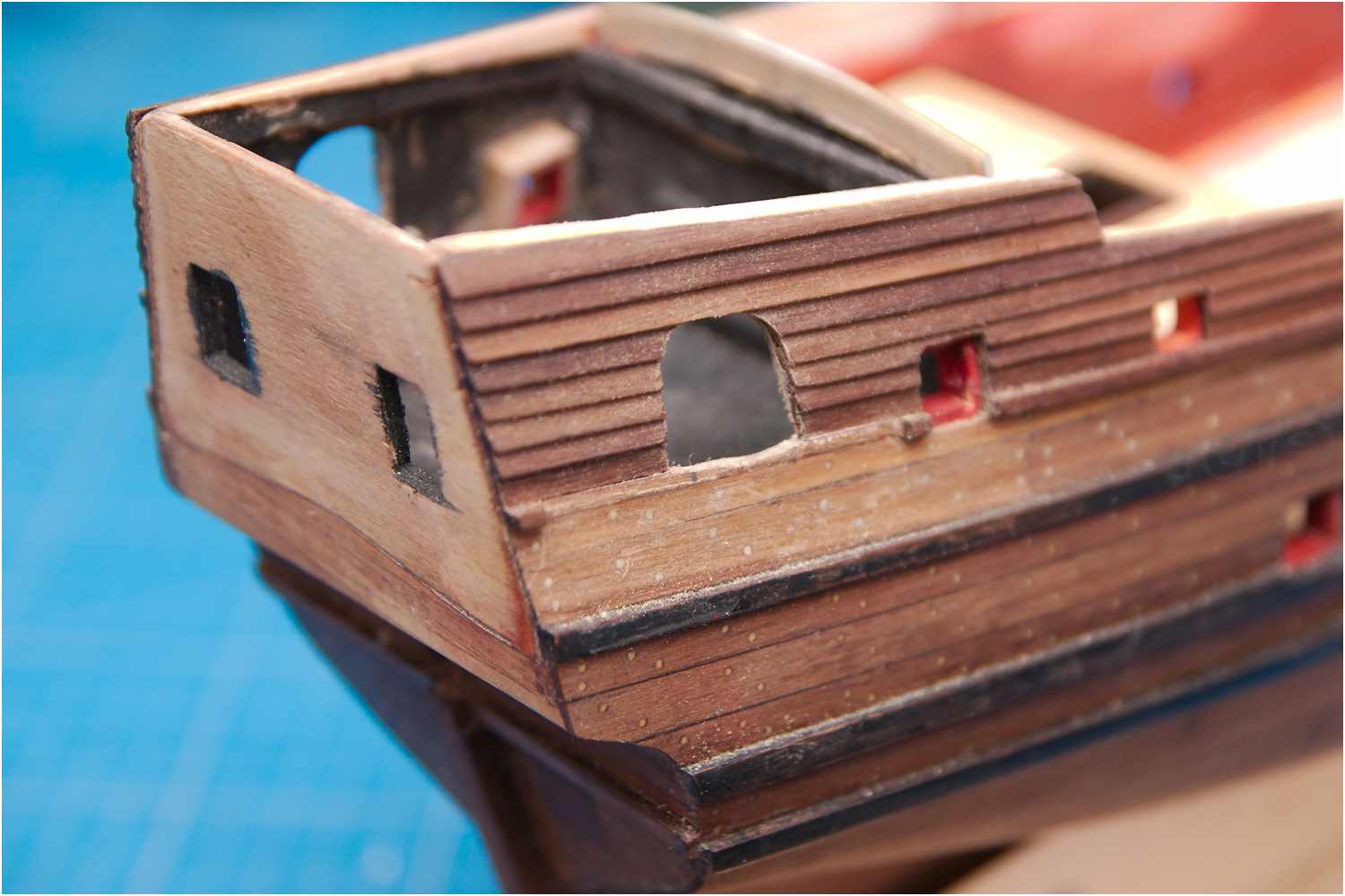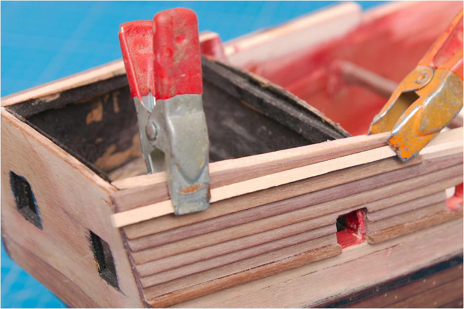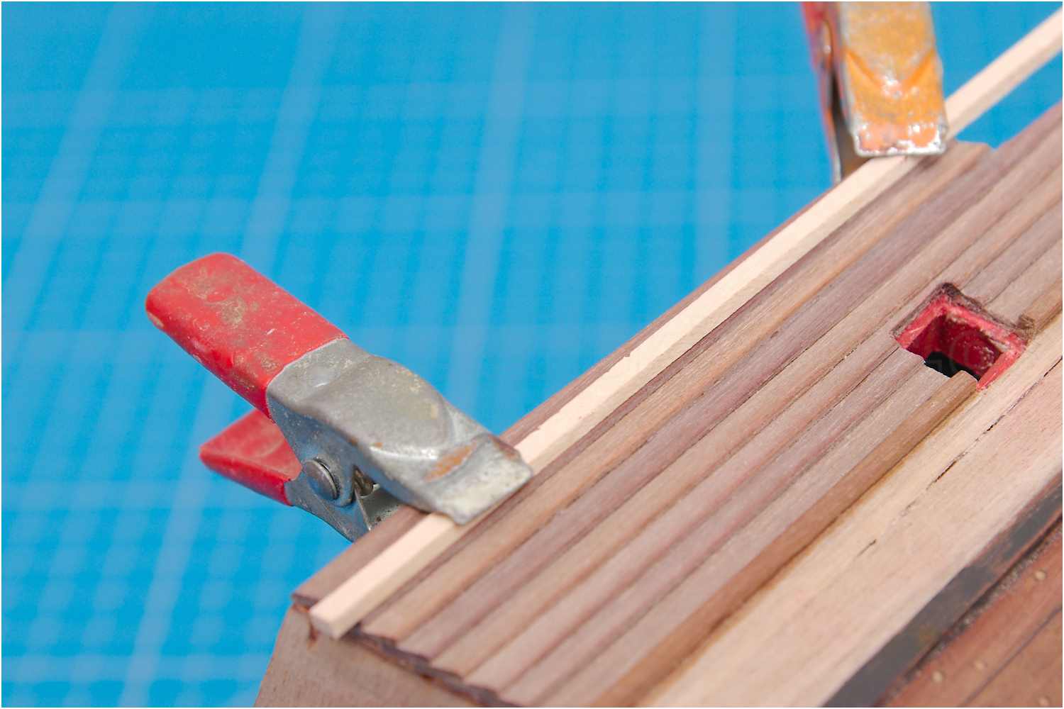 Der letzte Abschnitt der Beplankung des Rumpfes ist das Verkleben der Leisten im Bereich der Back und Aufbauten.