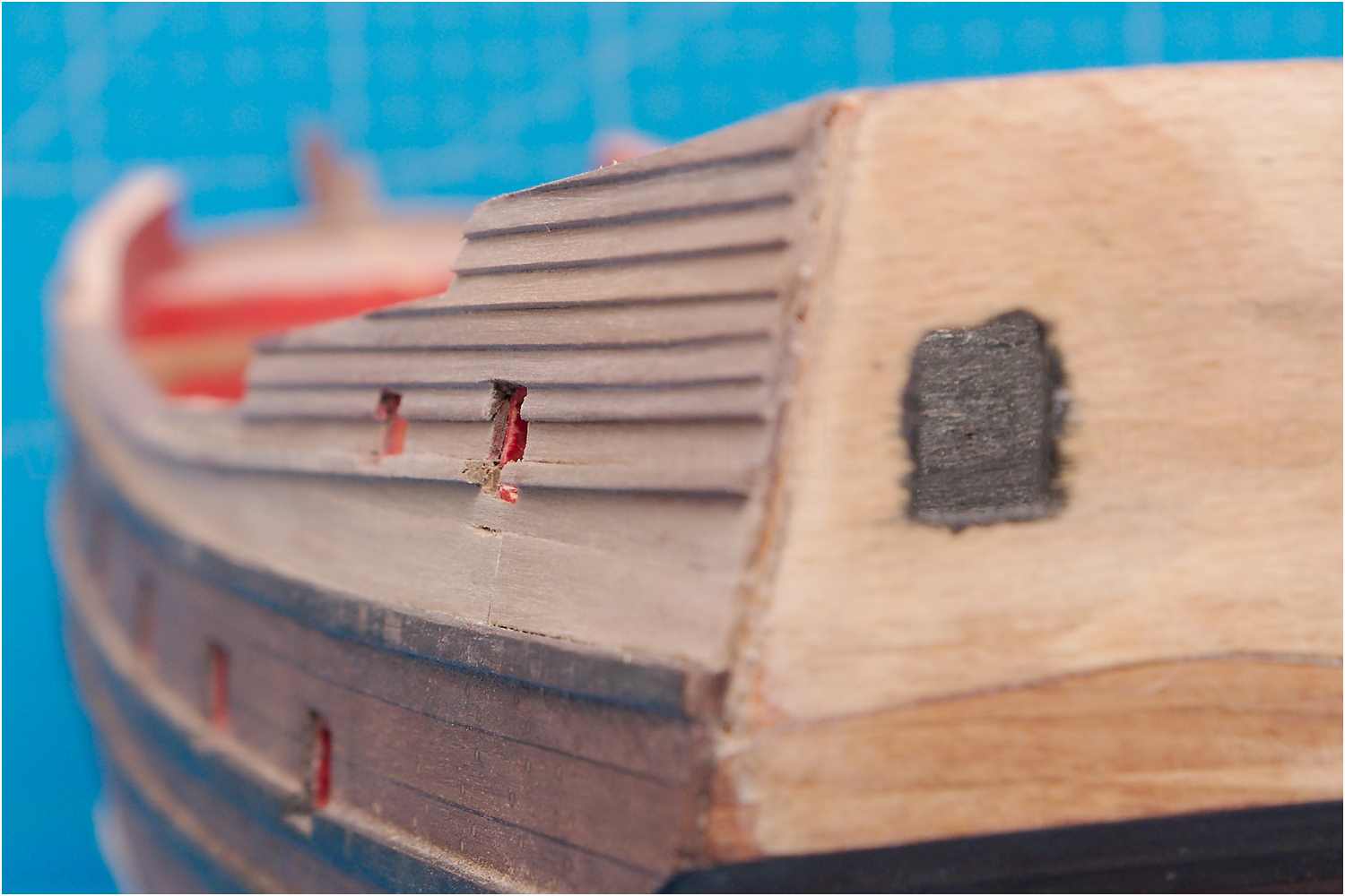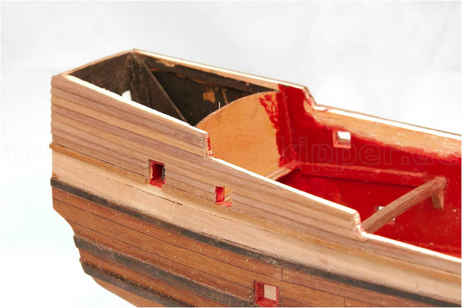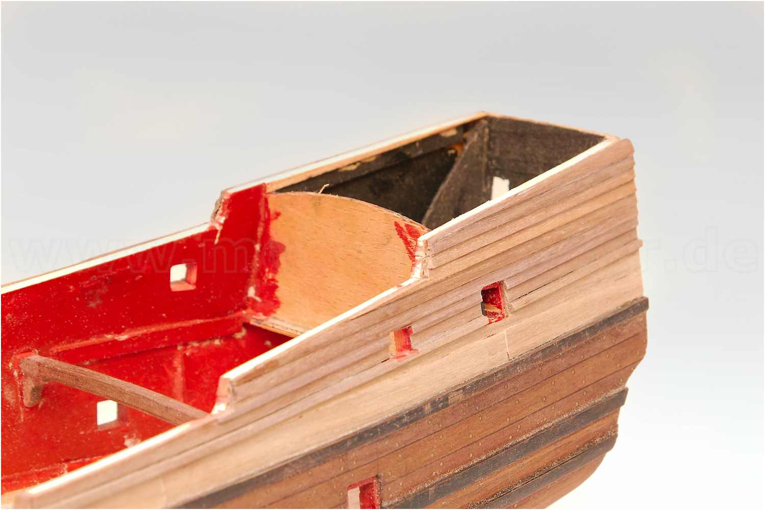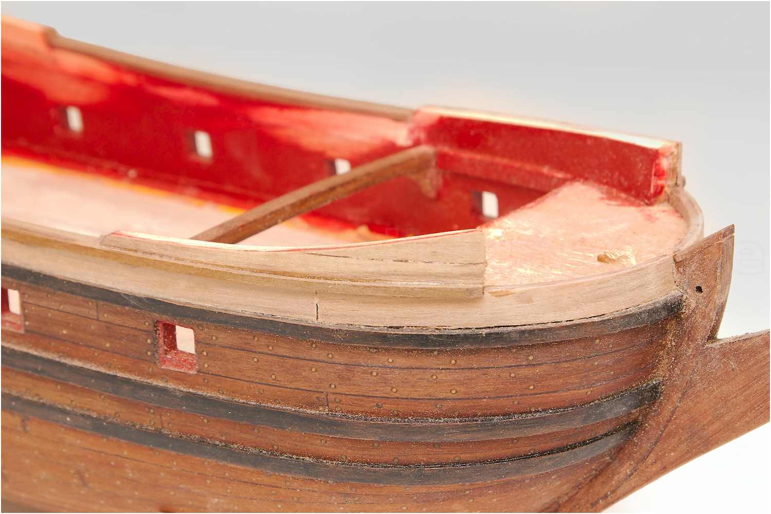 Vorher wurde von der Back, über dem Dollbord am Schanzkleid der Kuhl, bis zum Achterschiff durchgehend eine schmale Scheuerleiste aufgeklebt.