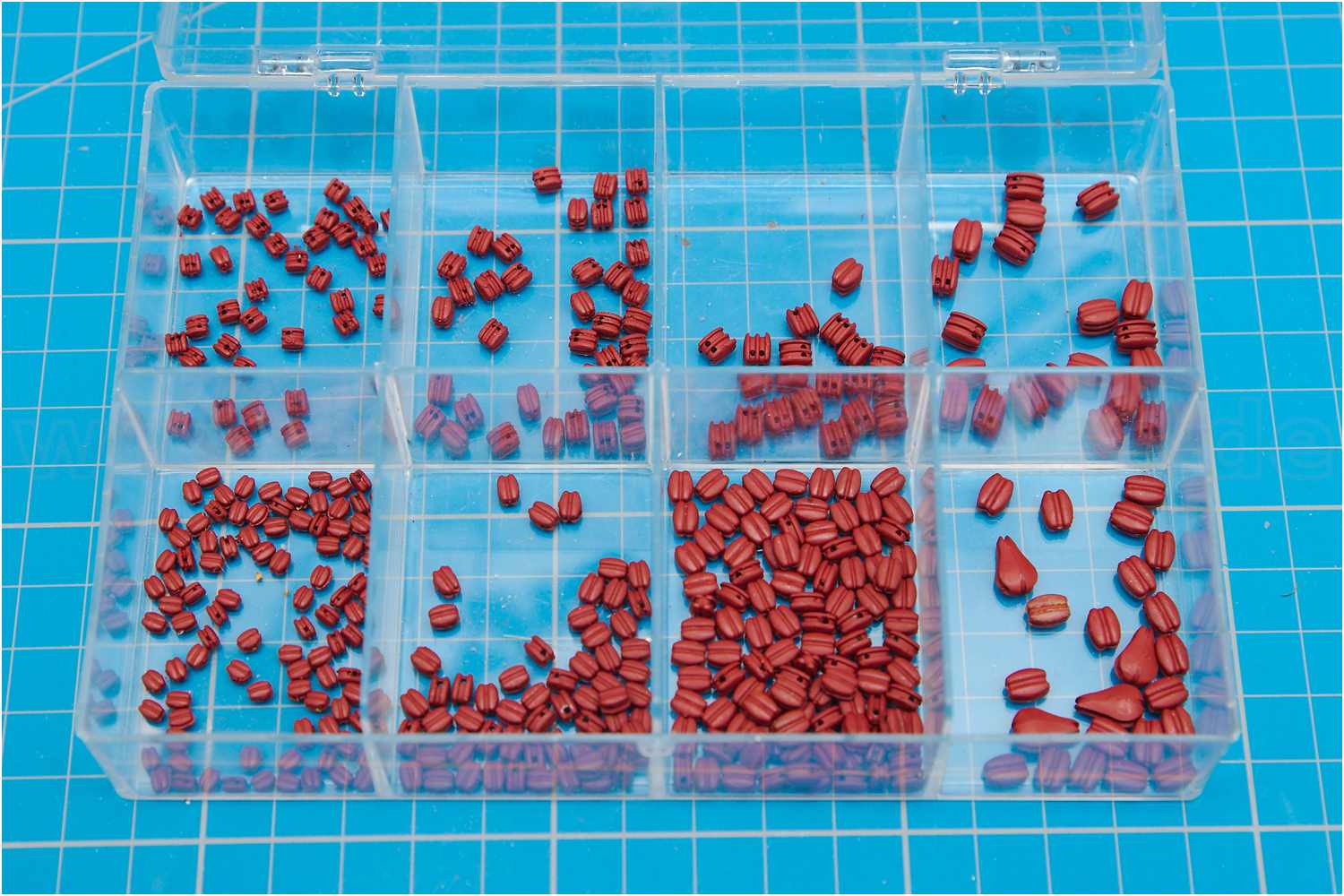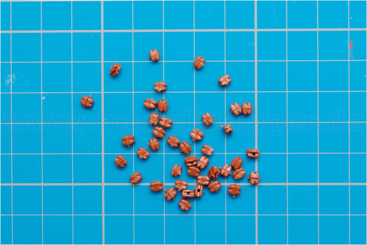 Nur noch die Wahl des Farbtons musste festgelegt werden. Die Entscheidung fiel auf Dunkelbraun (Revell 37) und so wurden 470 Blöcke verschiedenster Größe lackiert.