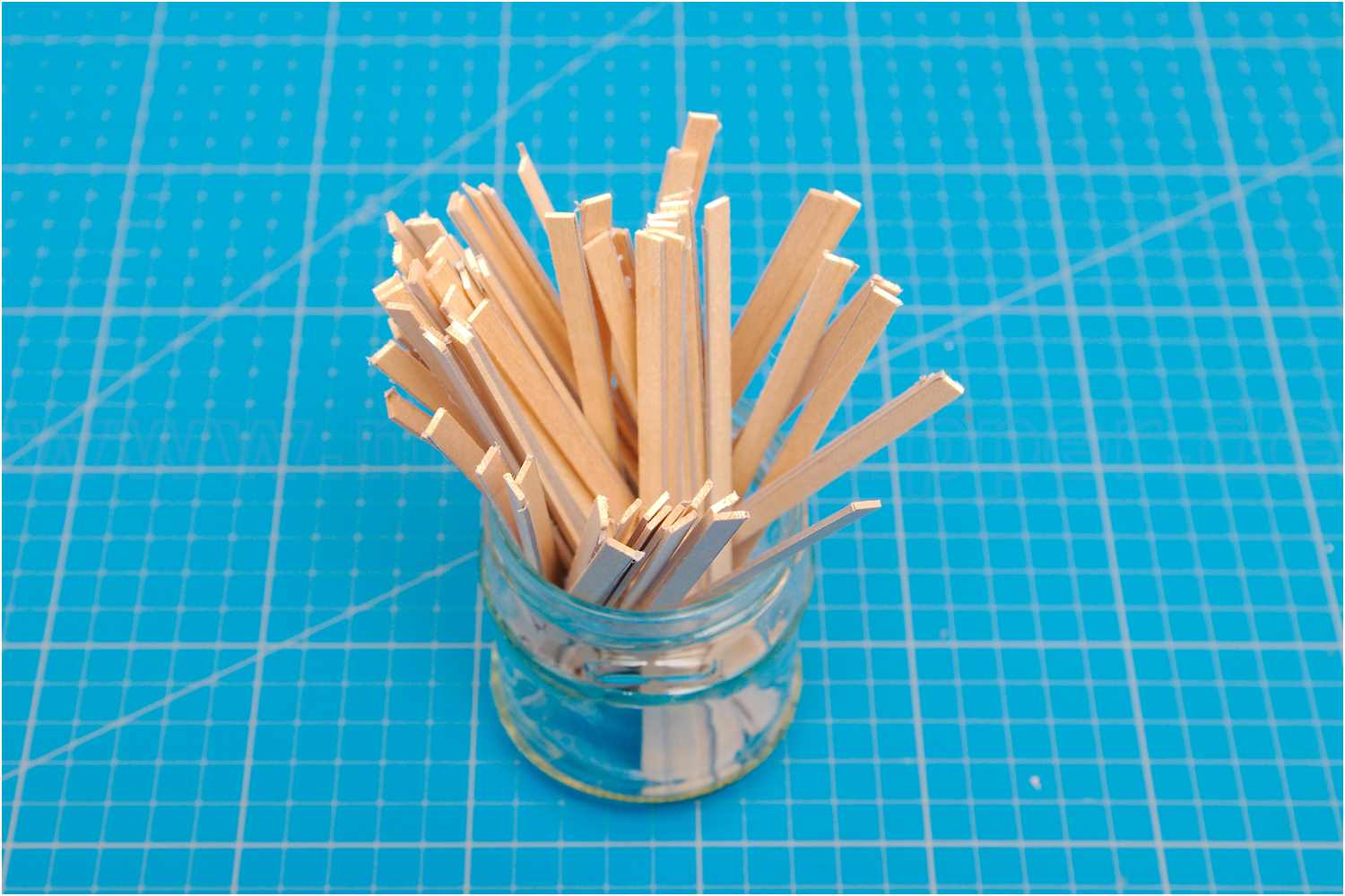 Verwendet man Zahnstocher aus normalem Holz, werden die Dübel sehr dunkel, da das Stirnholz offen liegt und sehr leicht Firnis oder Lack aufsaugt, verwendet man Bambus, sind die Dübel heller, aber es zeigt sich so etwas wie ein unschönes Mosaikmuster