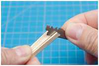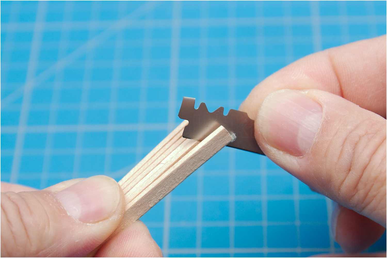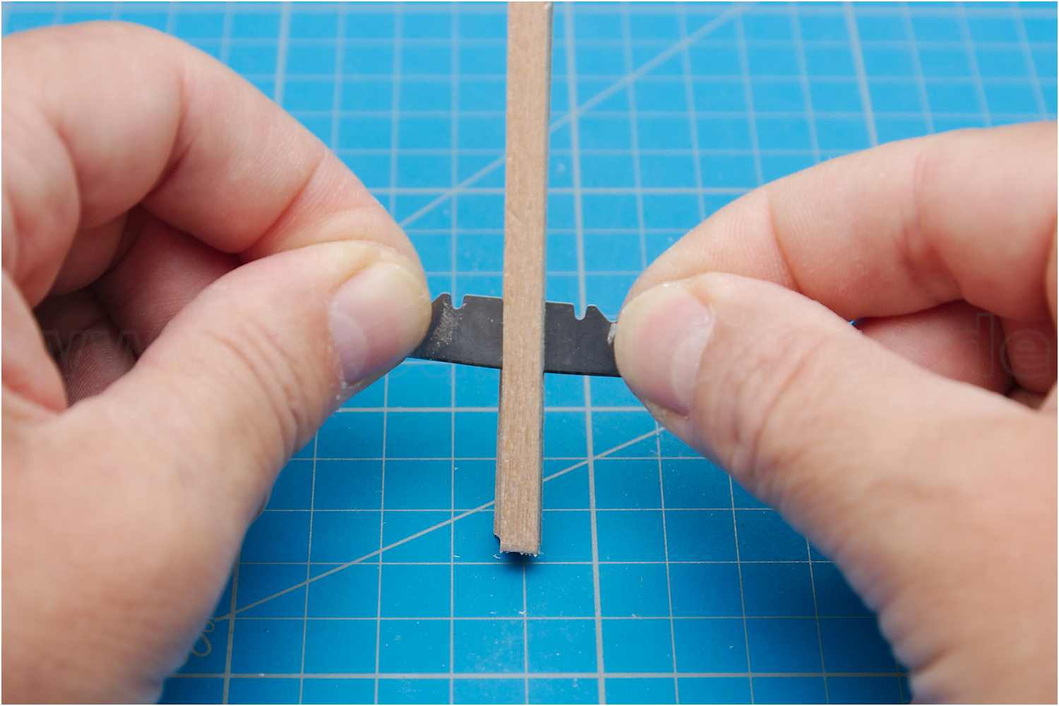 Jetzt nimmt man eine halbe Rasierklinge, spreizt die Leisten etwas auseinander und steckt die Klinge in den Zwischenraum, stellt das ganze Paket auf die Stirnseite und zieht mit beiden Händen die Klinge nach unten.