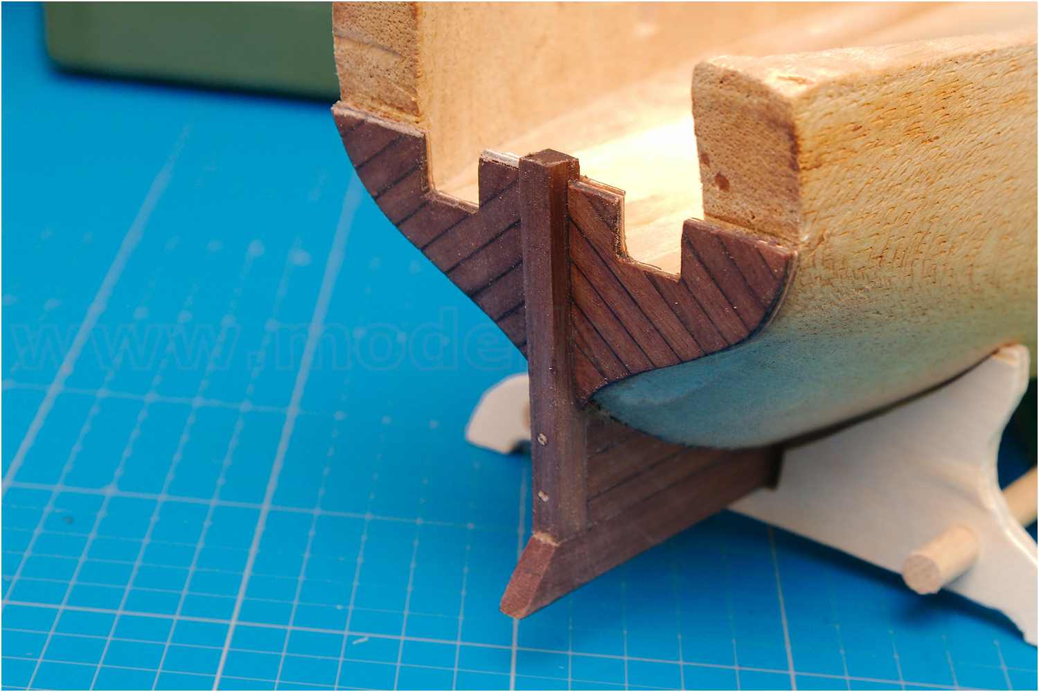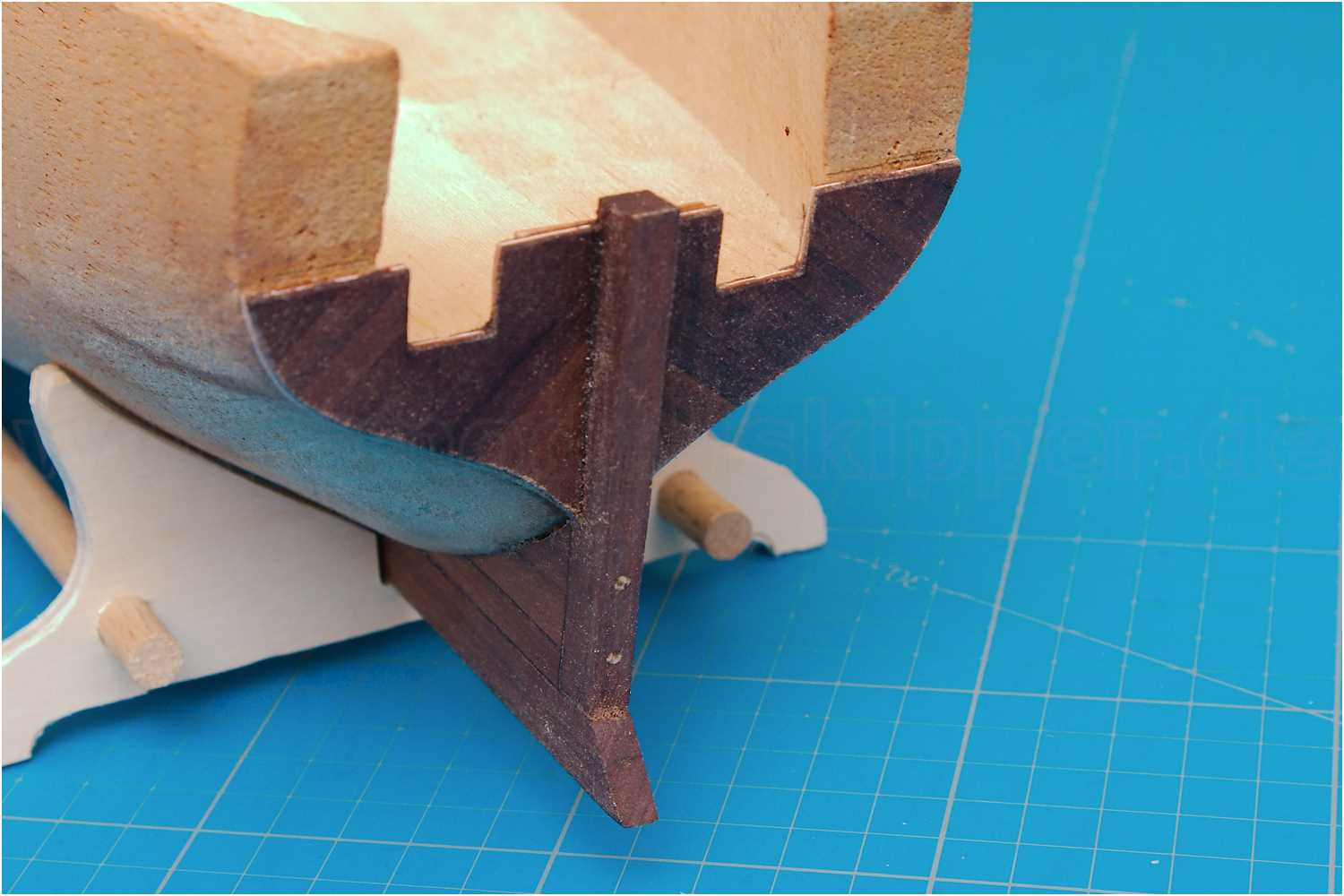 Die Gillung wurde mit mehreren Leisten als Paket grob in der späteren Form zusammengeleimt und die konkave Biegung dann sozusagen aus dem Vollen geschliffen. Diese Unterfütterung ist innen mit Balsa aufgefüllt und außen mit Furnierleisten beplankt.