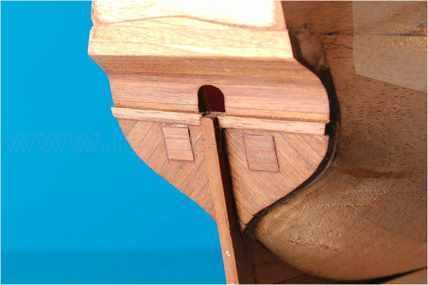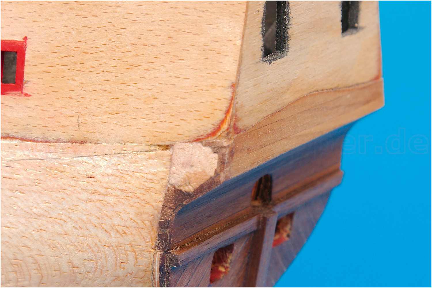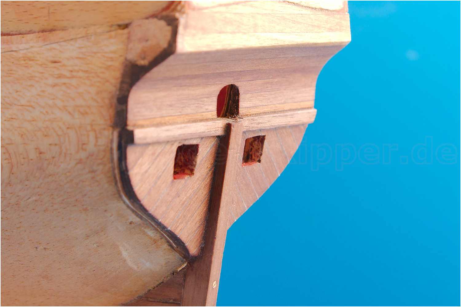 Dann doch den Heckbalken angeklebt, das Hennegat eingearbeitet und zum Abschluss den Unterspiegel neu beplankt. Die Stückpforten werden mit geschlossenem Pfortendeckel dargestellt.