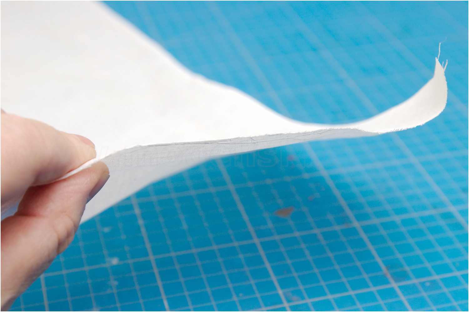 Der Stoff ist dann so steif, als hätte man dickes Papier in der Hand. Man kann ein recht großes Stück anheben, ohne des es abknickt, es raschelt sogar wie Papier, dennoch bleibt es ausreichend flexibel.