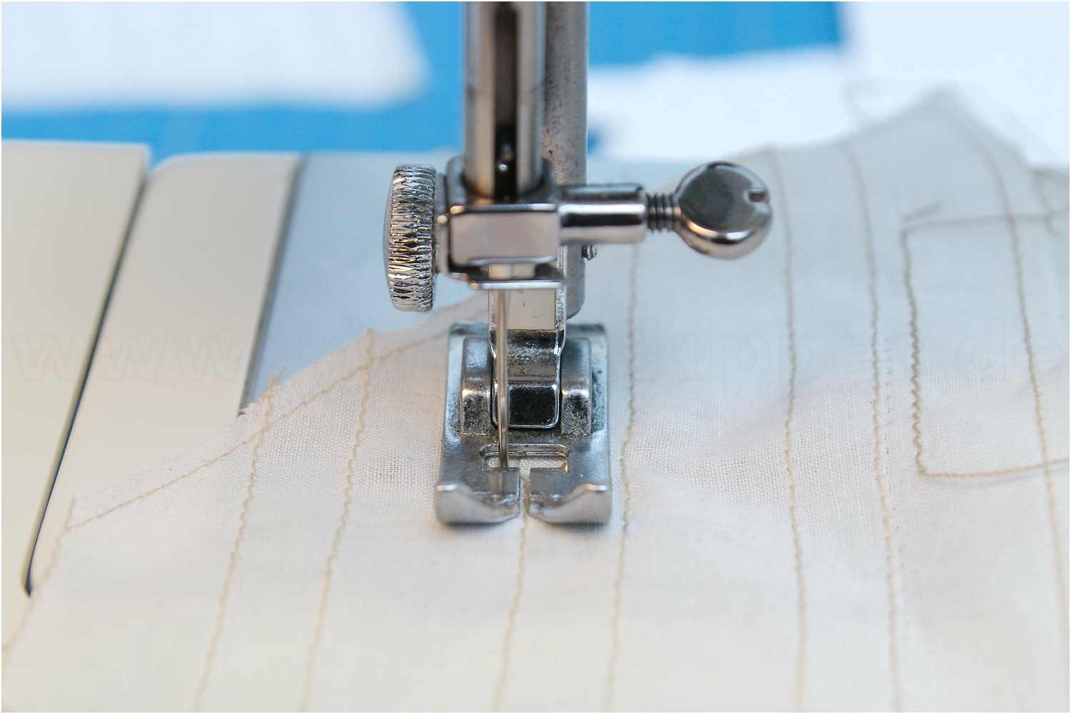 Anfangs ist mir ein Fehler unterlaufen. Nach dem Nähen einer Naht habe ich den Stoff umgedreht und in Gegenrichtung genäht. Irrtümlicherweise orientierte ich mich an der mittigen Nut am Nähfuß und habe durch den Versatz der Nähnadel unterschiedlich breite Bahnen genäht.