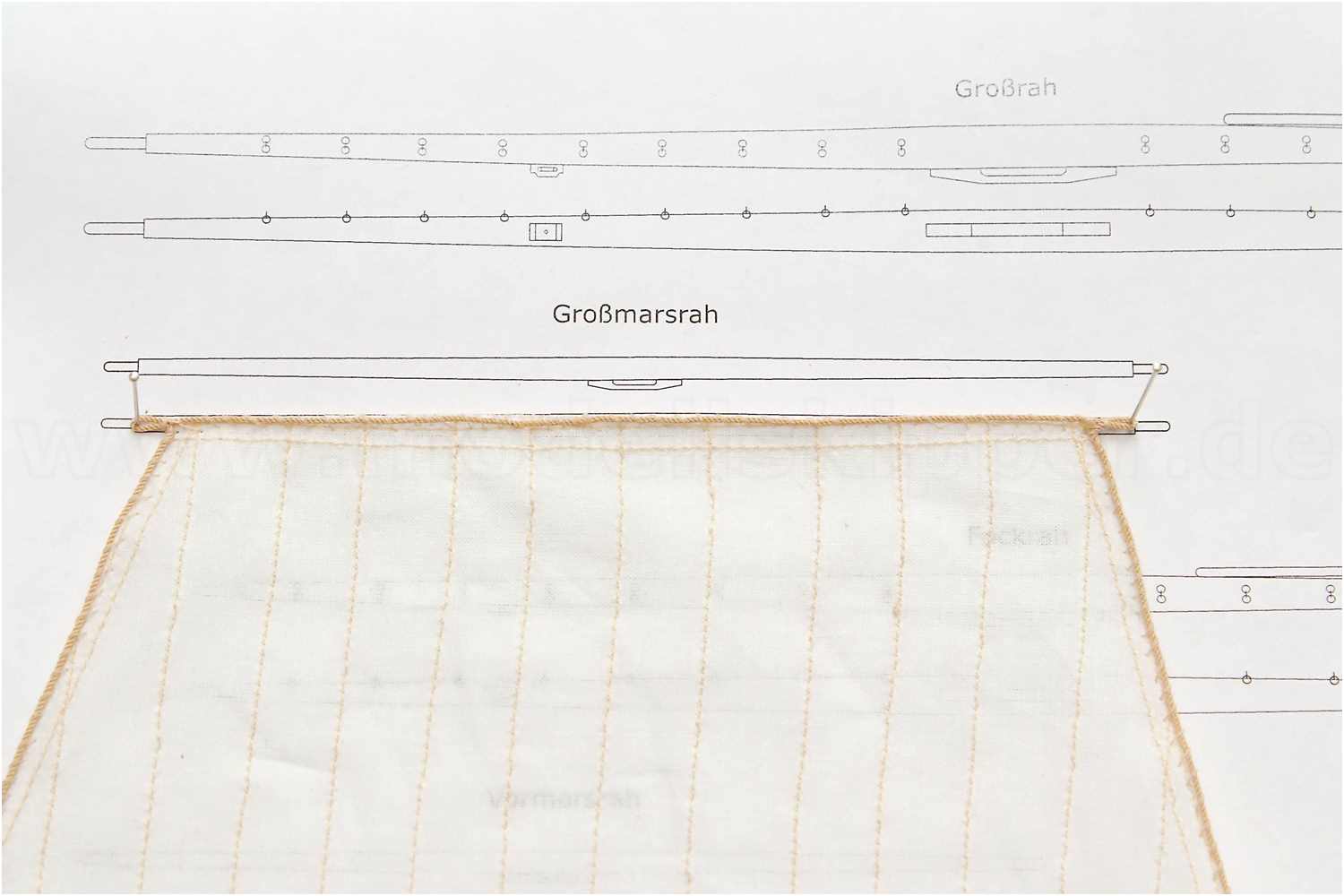 Da die Segel inkl. Liektau schon vorher komplett fertiggestellt wurden, konnte die Länge des Rahkorpus (ohne Nock) an die jeweilige Länge des Kopflieks des Segels inkl. gestrecktem Nocklegel gut angepasst werden.