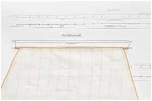 Um Abweichungen im Fertigungsprozess ausgleichen zu können, werde ich die Segel vor den Rundhölzern anfertigen. Der Segelstoff wird mehrfach gewässert, vor dem Nähen gestärkt und erhält ein Liektau, was sich ggf. auf die Breite des Segels auswirken könnte, um so die Rahen genau auf Maß herstellen zu können.