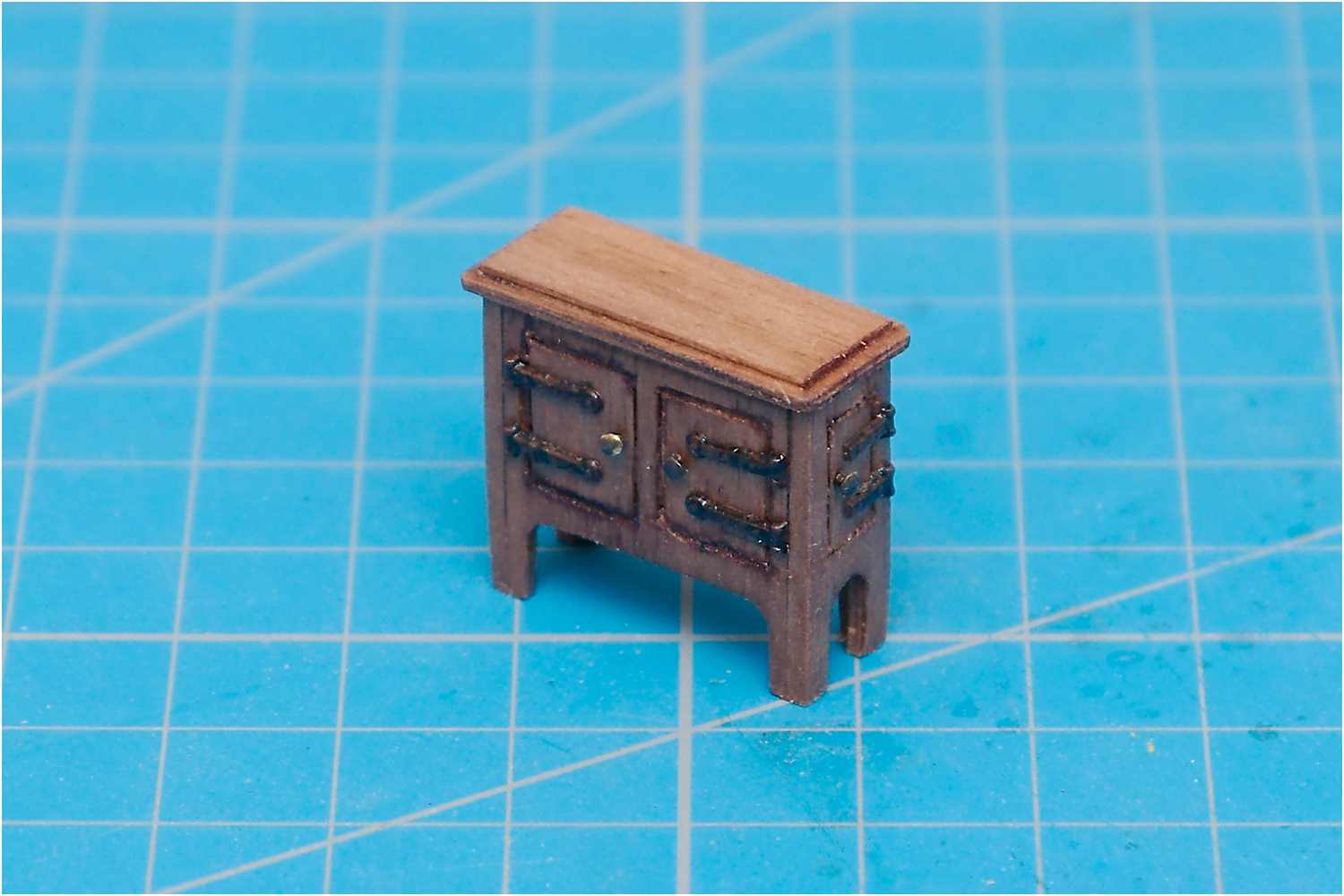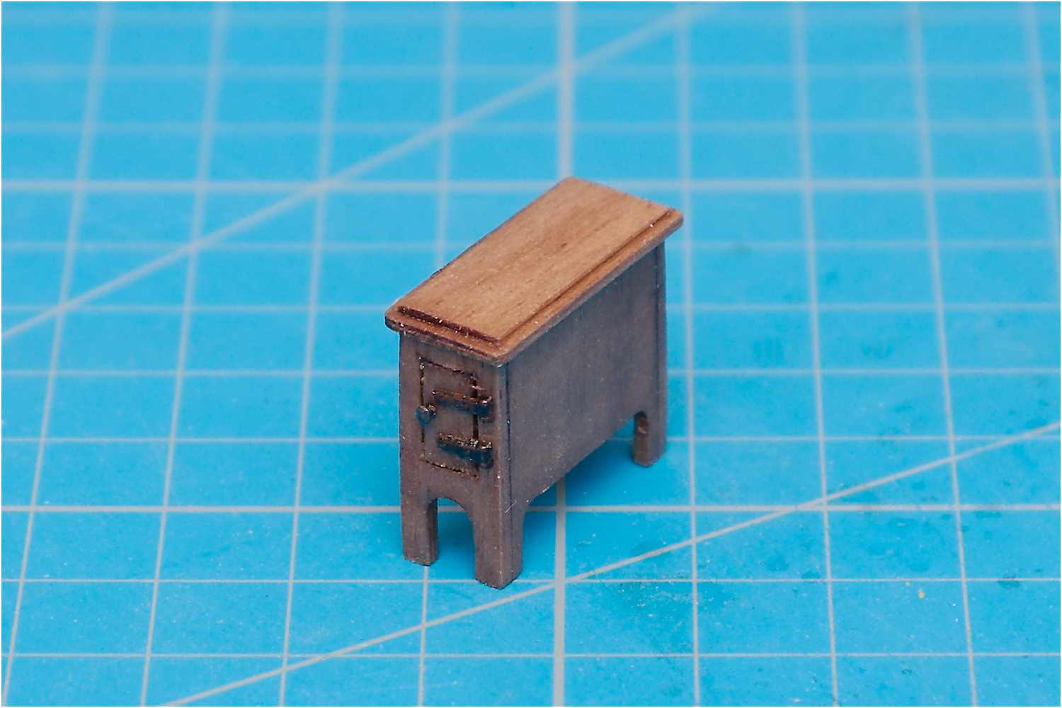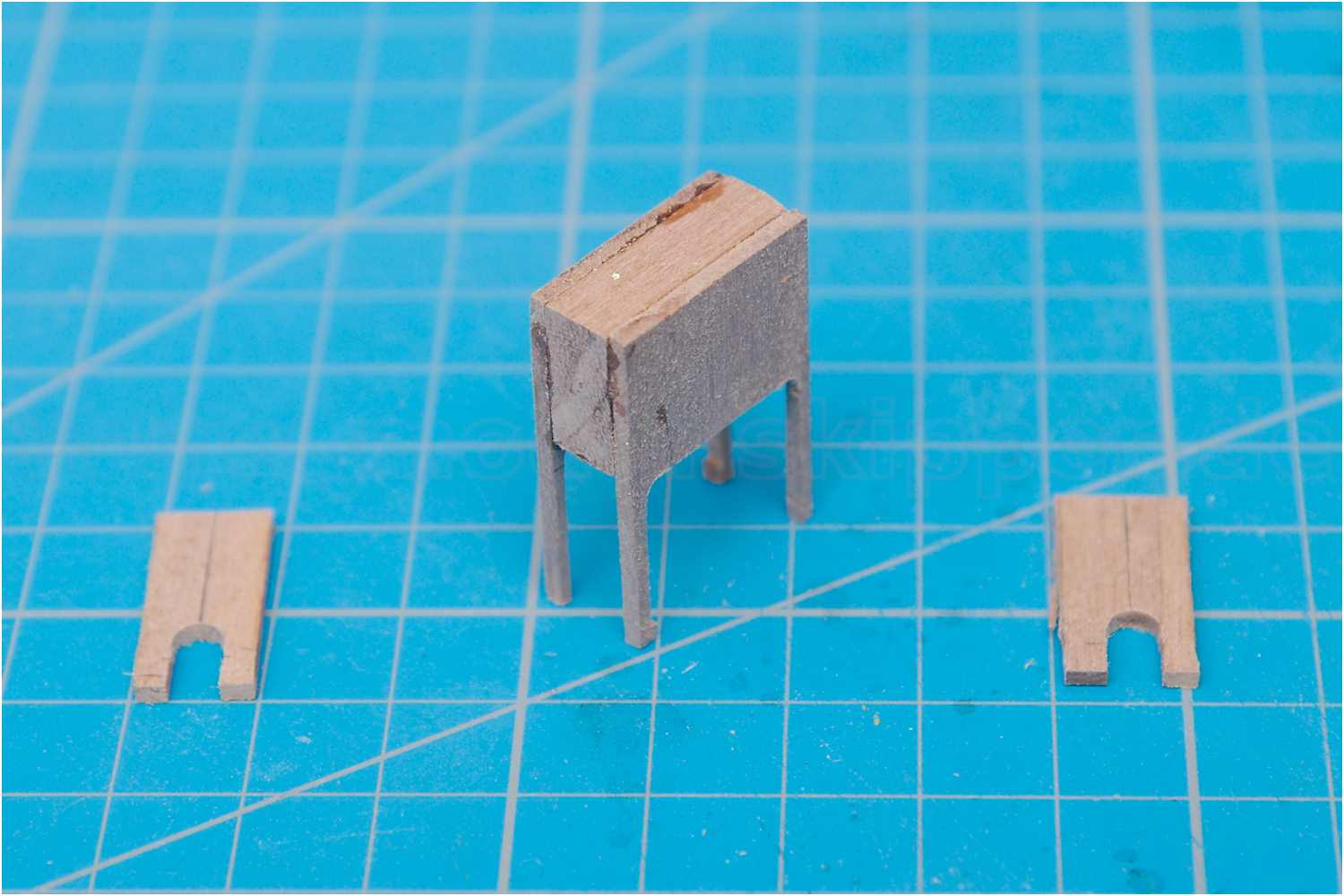 Bei den ersten Versuchen spaltet sich beim Ausarbeiten der Rundungen an den recht dünnen Fußstützen und bei der Ausarbeitung für die Öffnungen der Türchen mehrfach das dünne Furnierholz. In der Folge der Bearbeitung brach dann noch die komplette Konstruktion beim Einspannen in einen kleinen Schraubstock auseinander, da die Seitenteile lediglich gegeneinander verklebt waren.