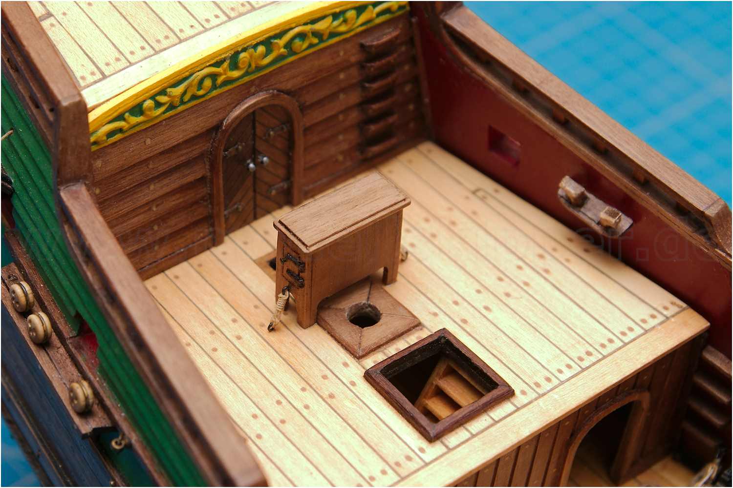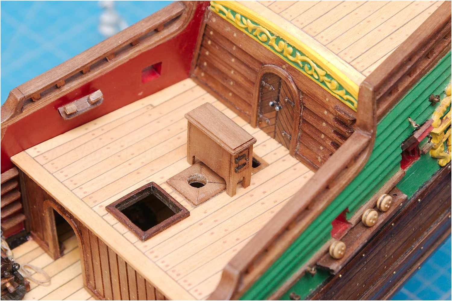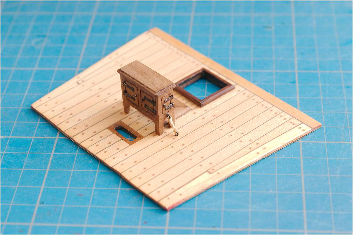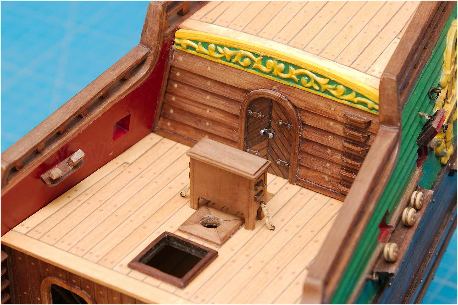 Das Kompasshäuschen ist lackiert, an seinem Stammplatz aufgestellt und abschließend seefest verzurrt.