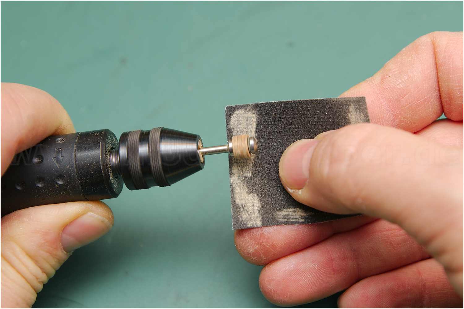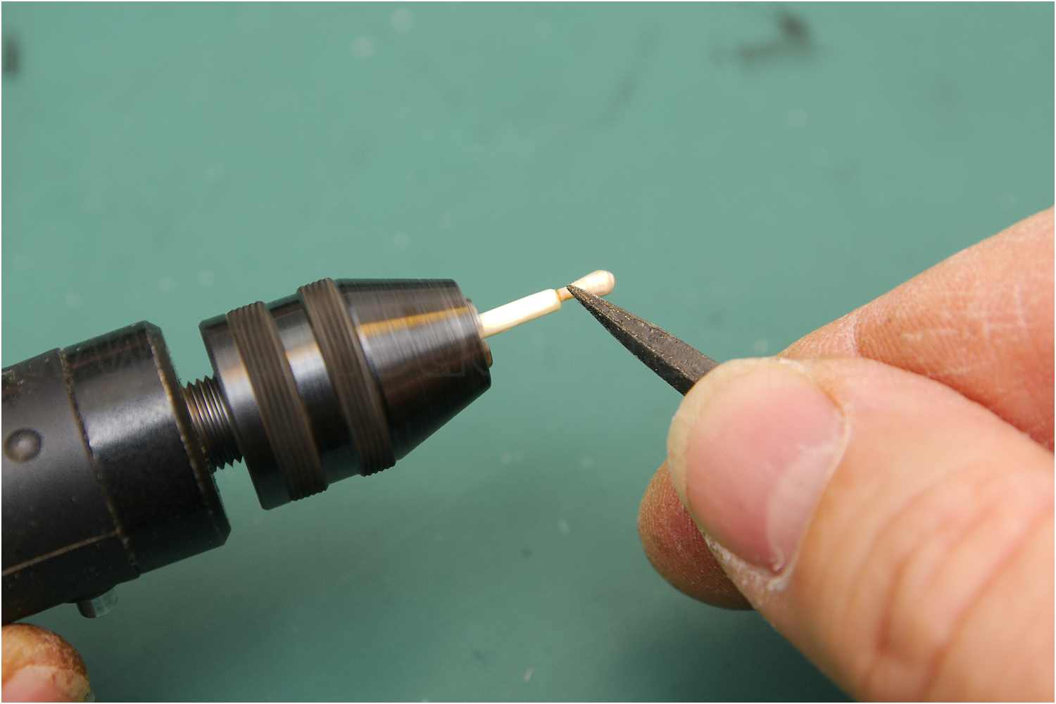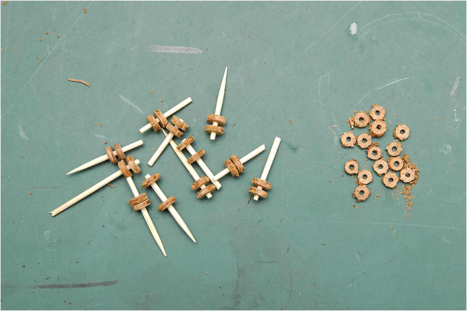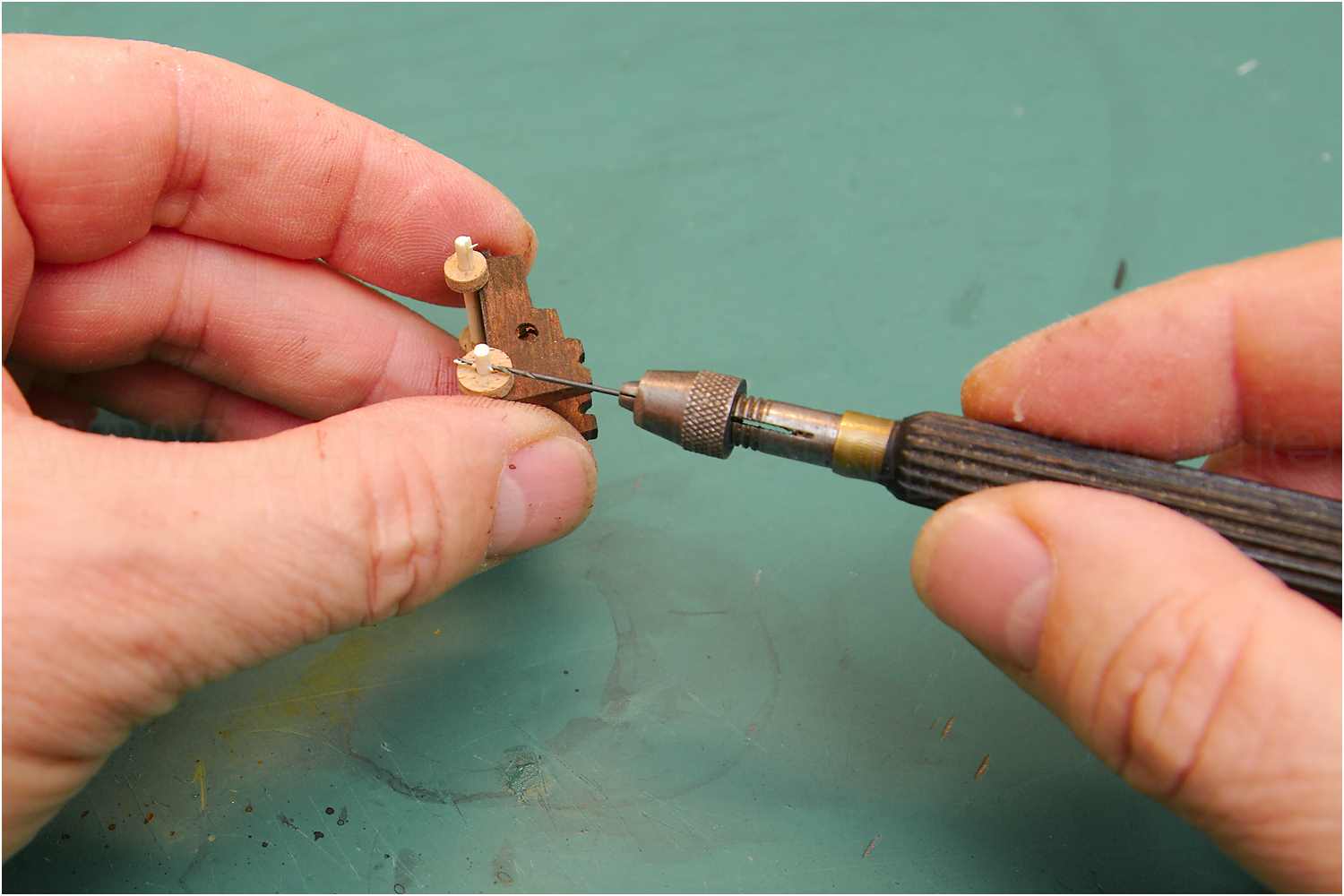 Aus Zahnstochern wurden die Achsen hergestellt, in Handbohrmaschine eingespannt und für die Bohrung der Räder abgeschliffen.