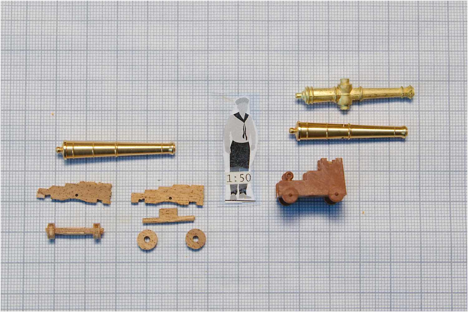 Die Länge des Rohrs passte, aber die Lafette nicht, wie man im Vergleich mit dem Maßstabsmännchen und der Lafette aus dem Bausatz gut erkennen kann.