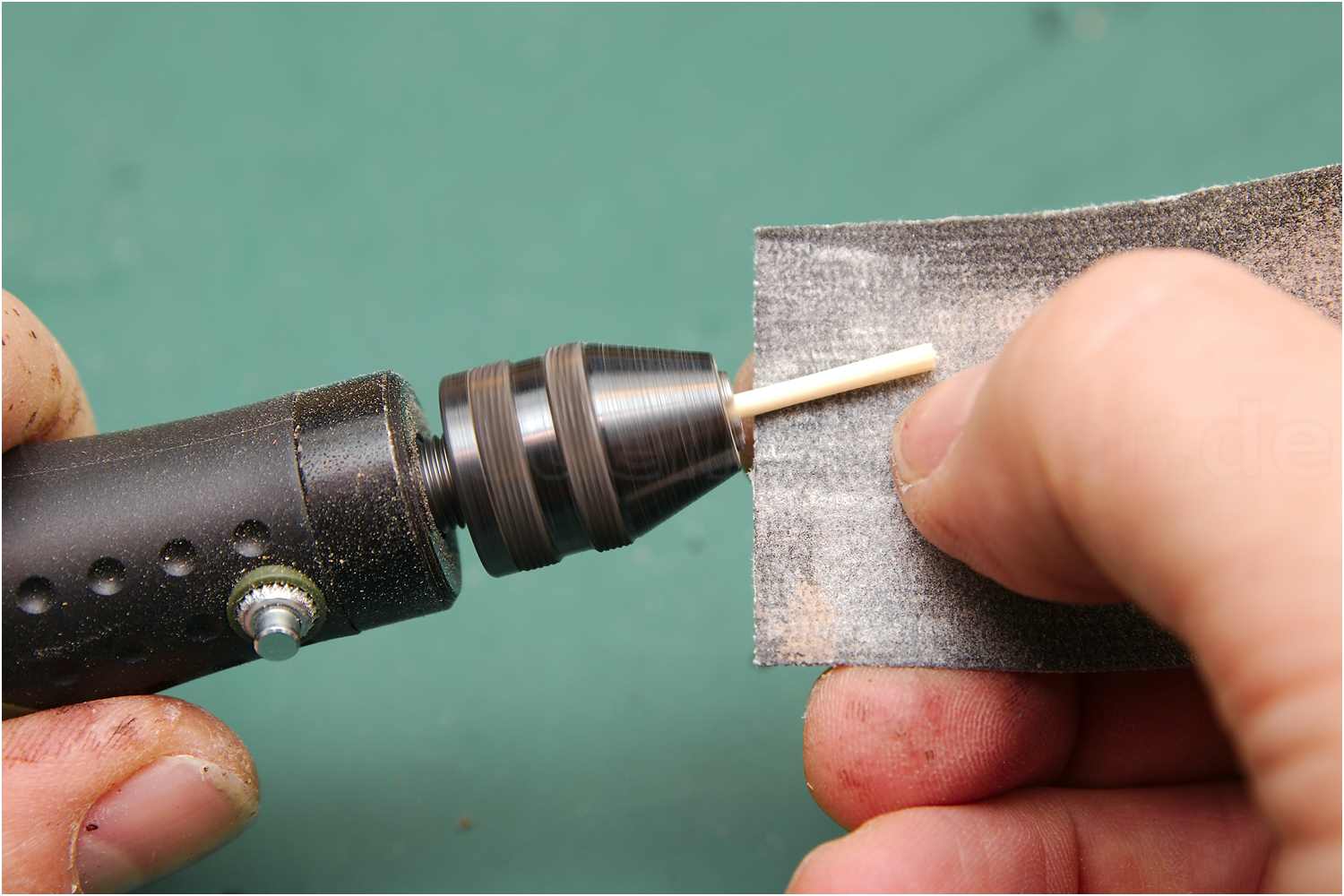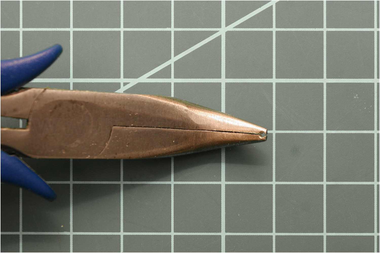 Jetzt nur noch die Enden an einer Trennscheibe planschleifen. Am besten nutzt man eine gebogene Spitzzange. So kann die obere und untere Schleiffläche der Trennscheibe für beide Seiten des Bolzen genutzt werden, ohne umgreifen zu müssen.
