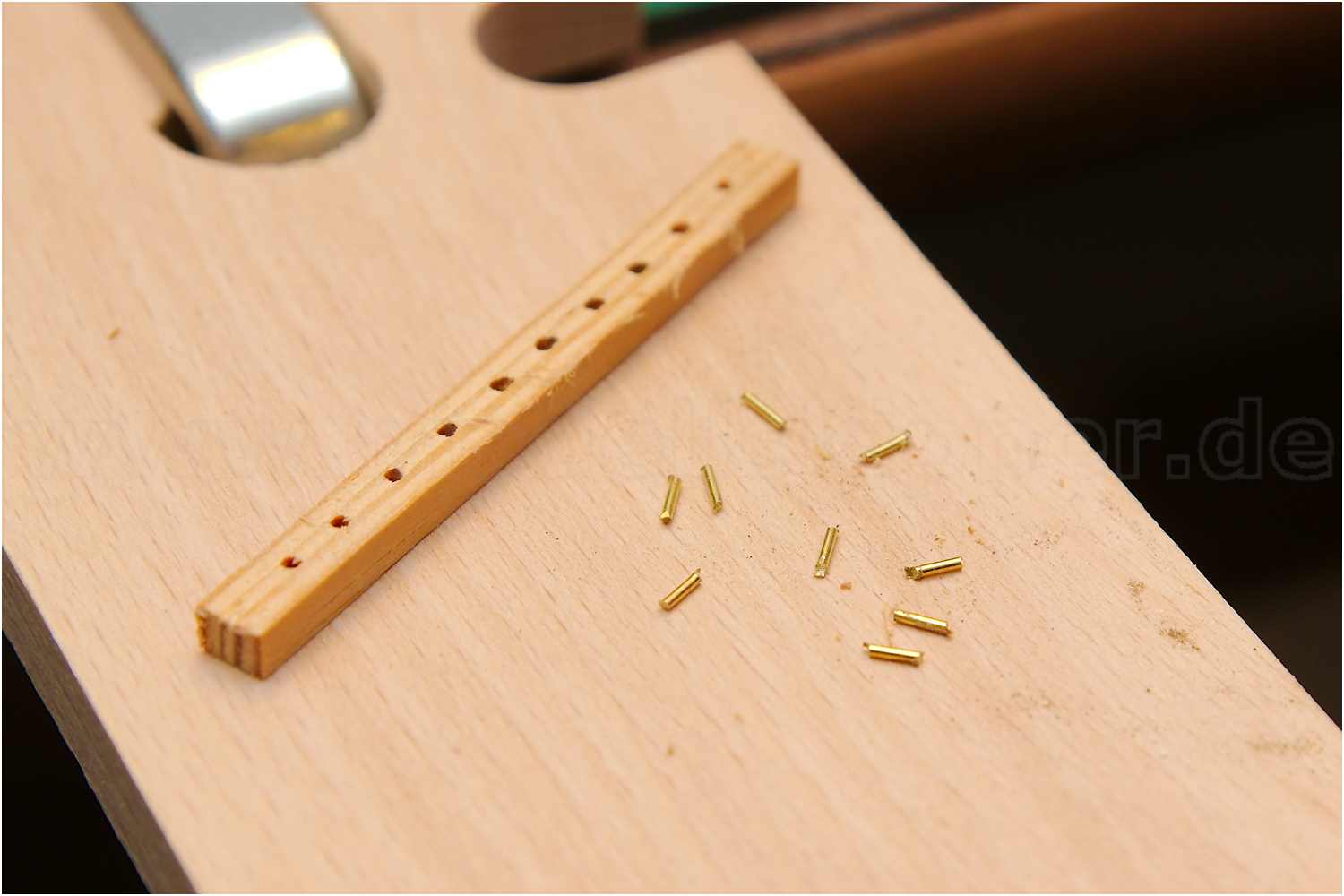 Für die Herstellung der Radbolzen mit gleicher Länge habe ich in eine entsprechend dicke Holzleiste mehrere Löcher gebohrt und an ein Holzbrettchen geklammert. Den Messingdraht in das Loch gesteckt und abgekniffen. Wird die Lochleiste entfernt, fallen die Stifte einfach unten raus.