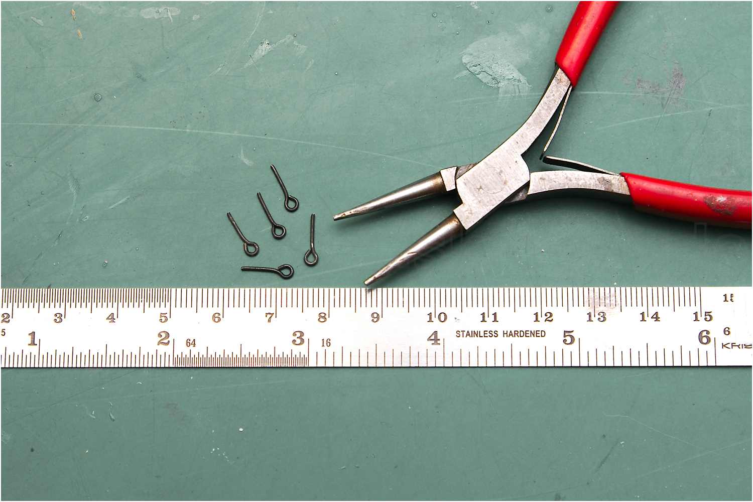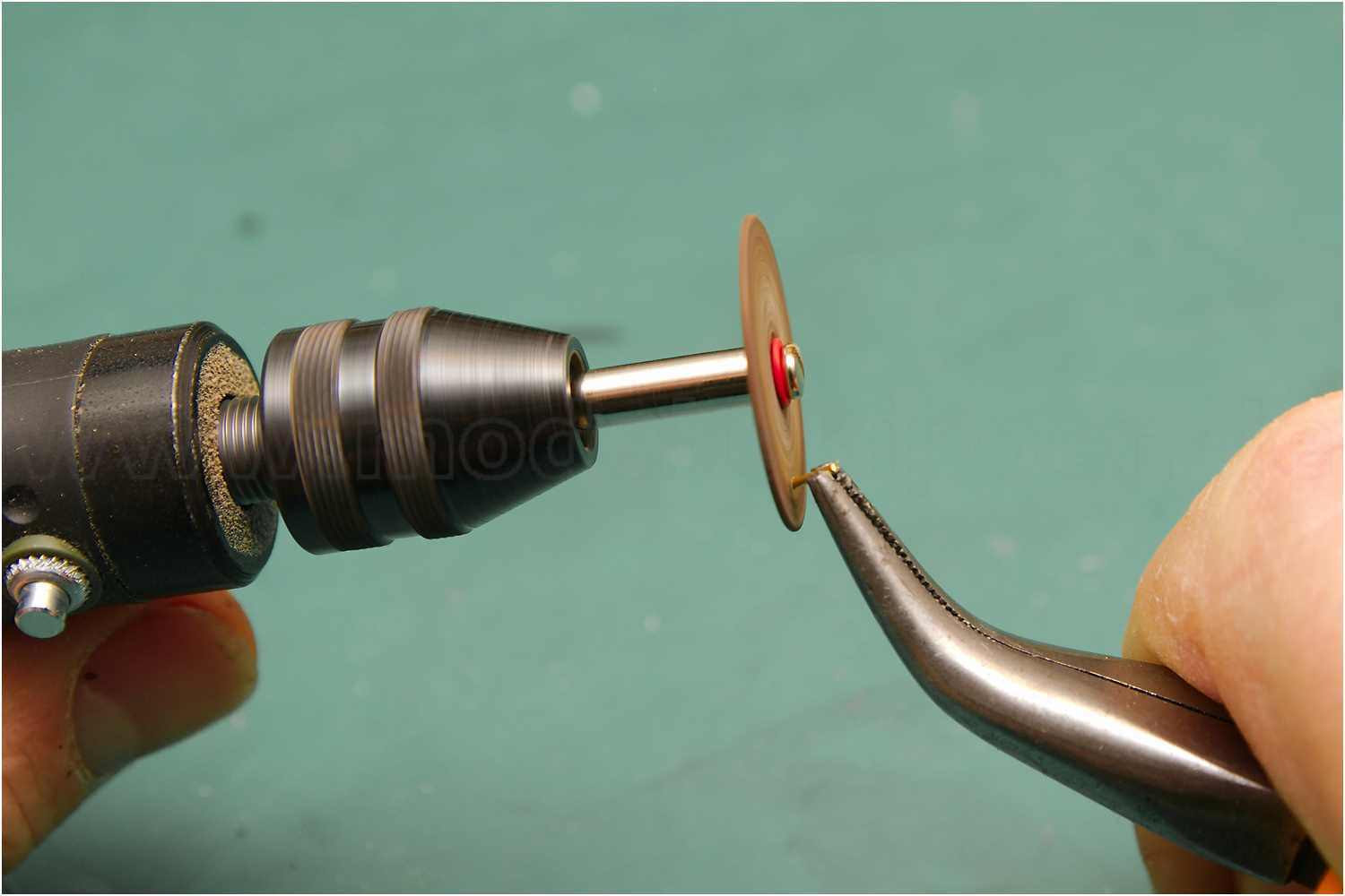 Für ähnliche Arbeiten, bei denen kleinste Stifte oder Niete gehalten werden müssen, habe ich mir mal eine gebogene Spitzzange modifiziert. Eine Zange mit Zangenschnäbel ohne Hieb habe ich ein kleines Loch gebohrt, so hat der Stift sicheren Halt.