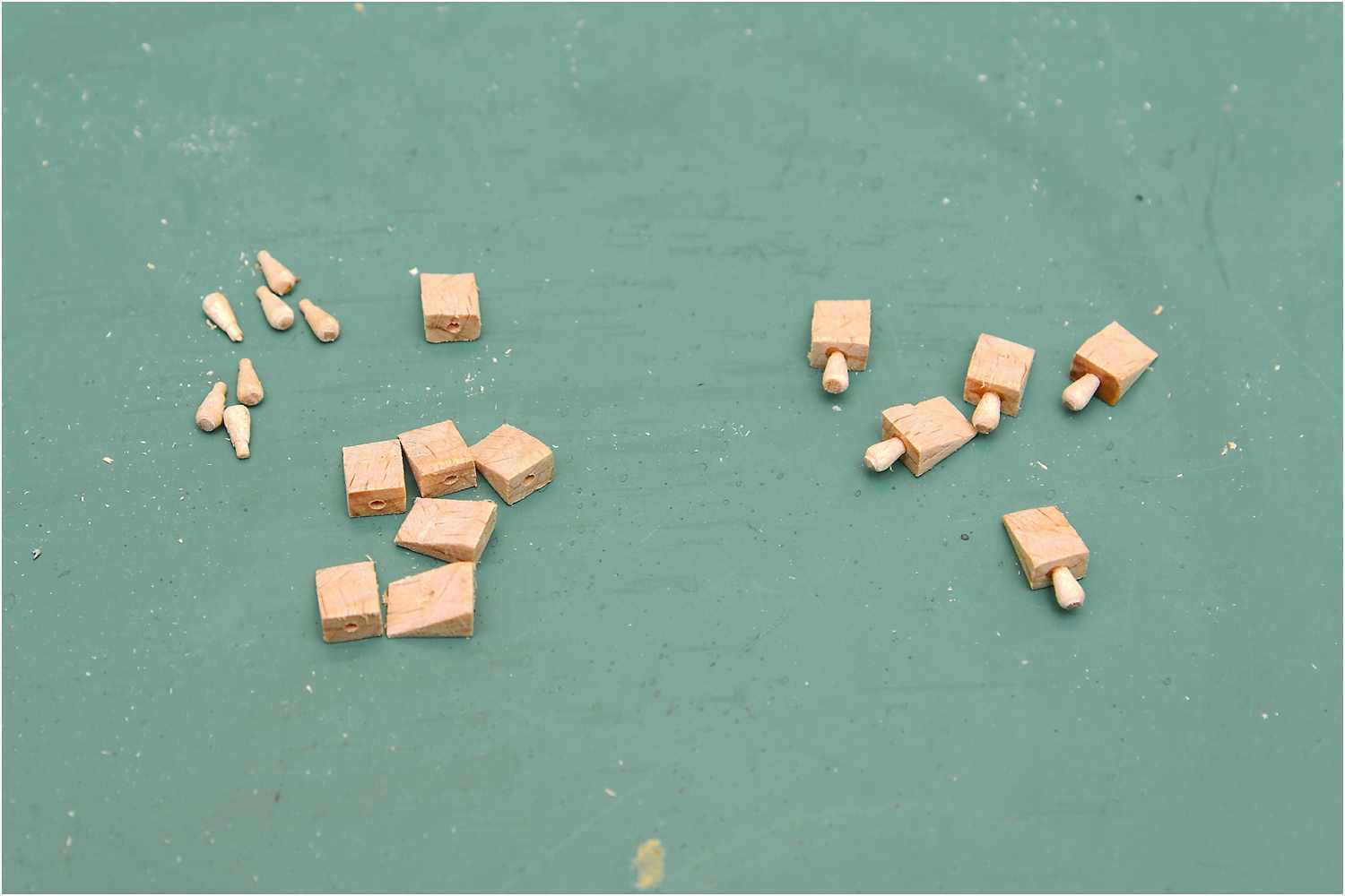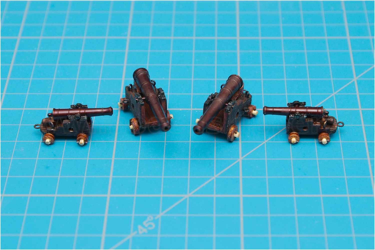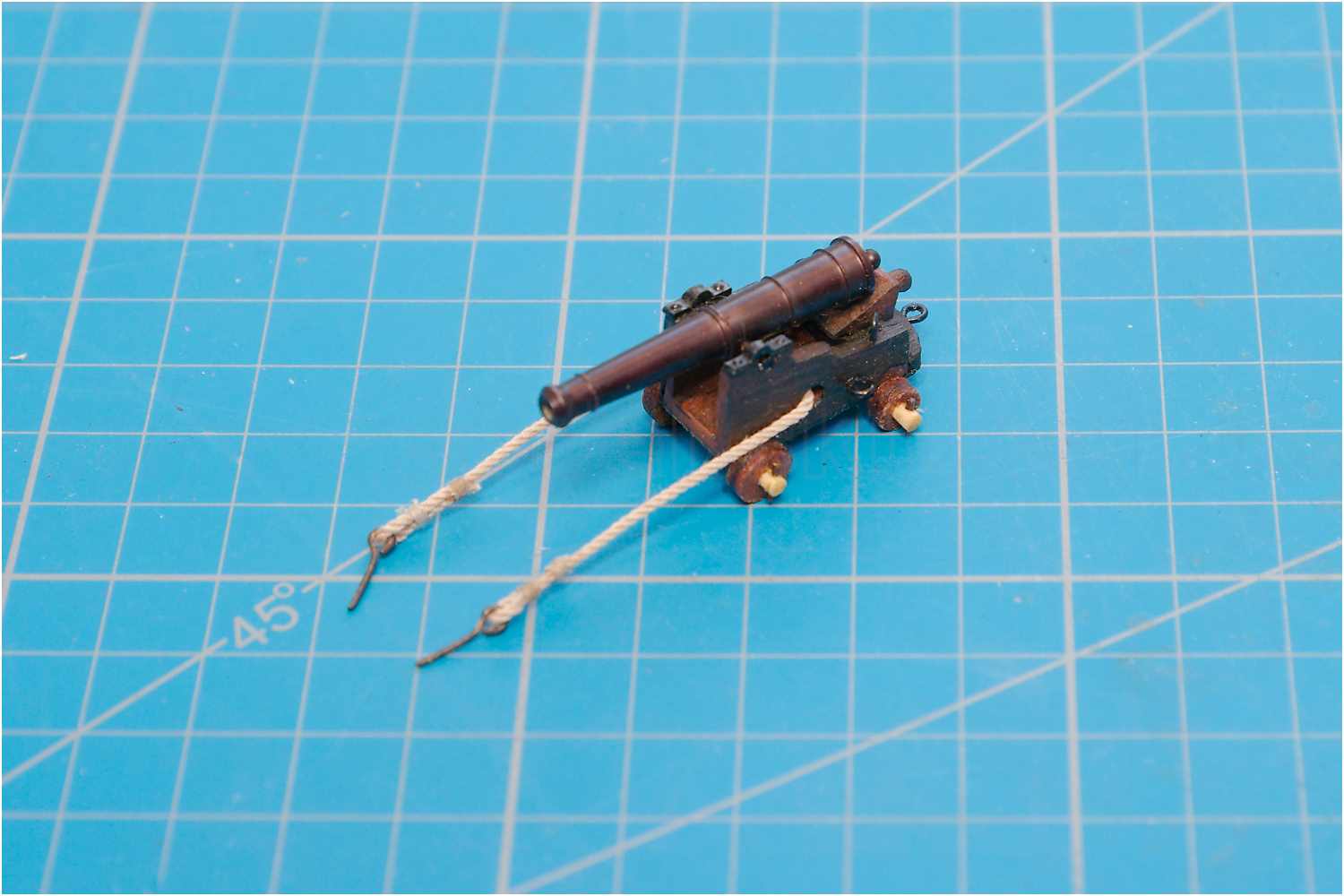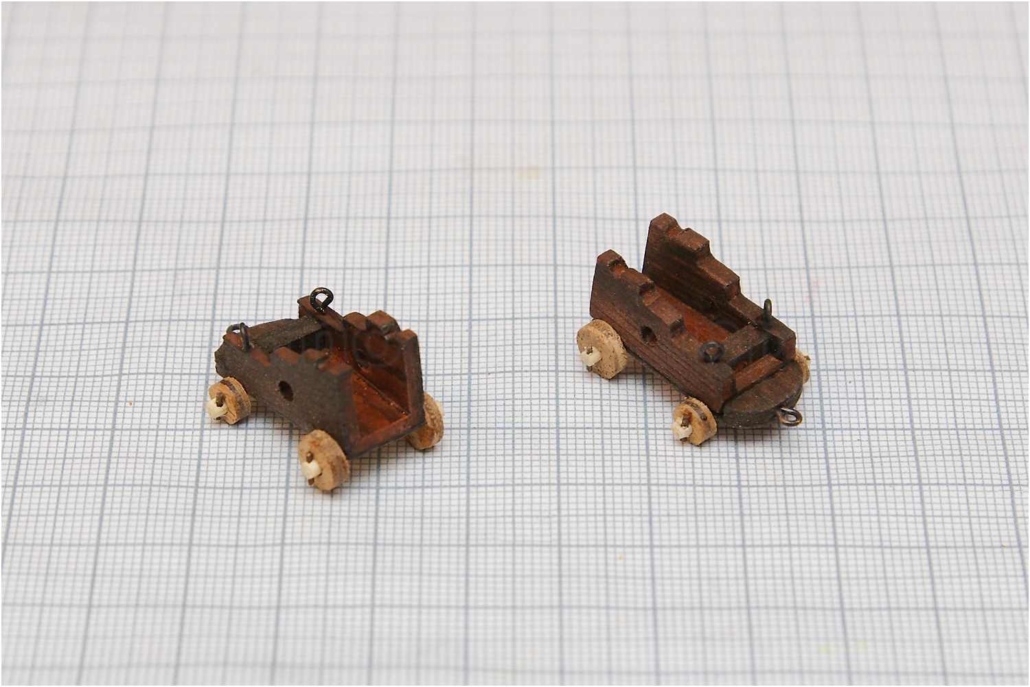 Nach dem vorläufigen Zusammenbau der Kanonen habe ich noch die Richtkeile angefertigt, die Handgriffe wurden aus einem Zahnstocher in der Proxxon gedrechselt.