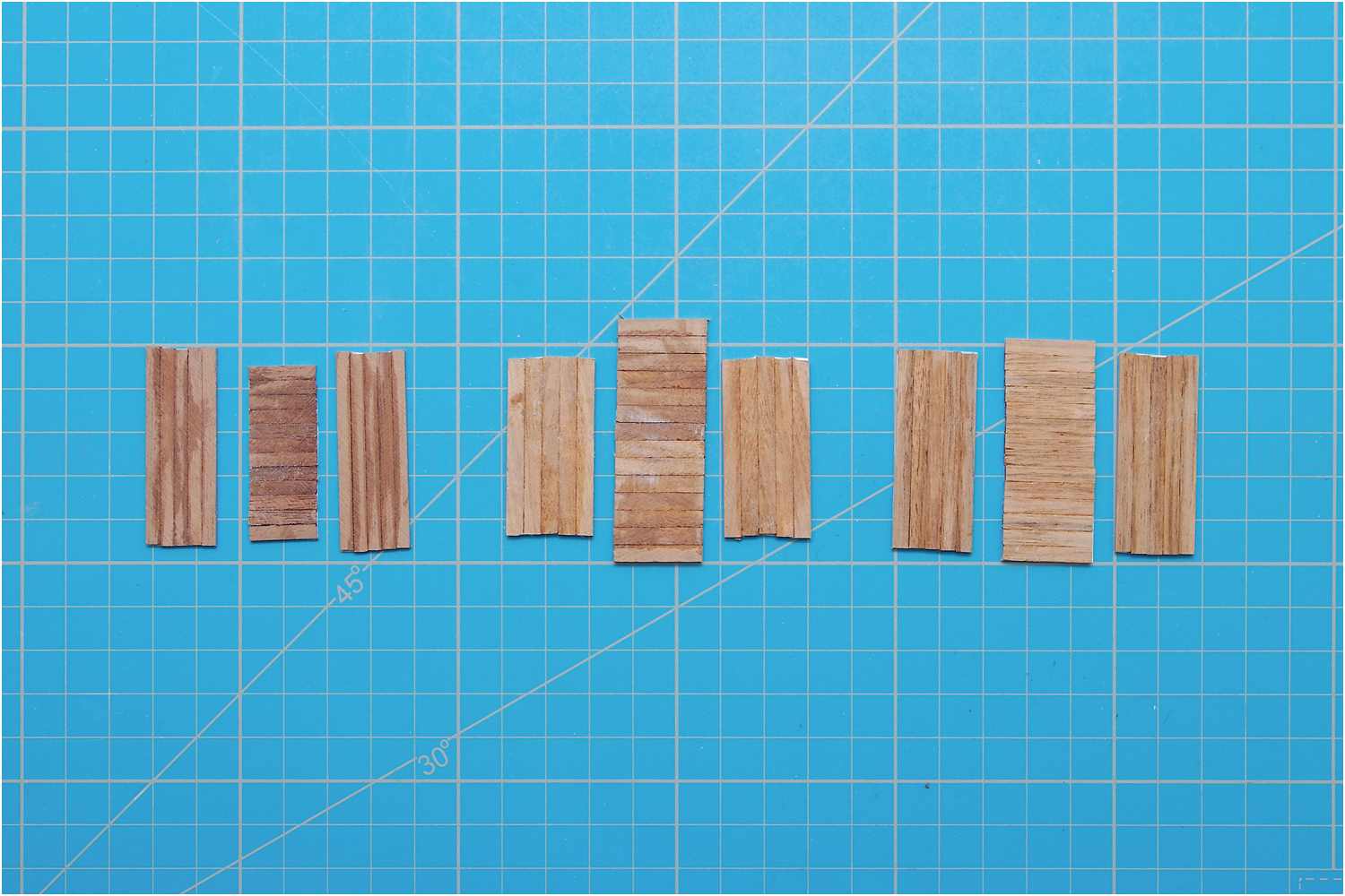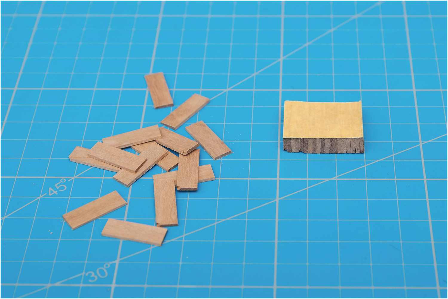 Dafür habe ich das Kreppband unter einen Winkel gelegt und konnte so die Leistenstücke recht einfach zu einem Block zusammenstellen.