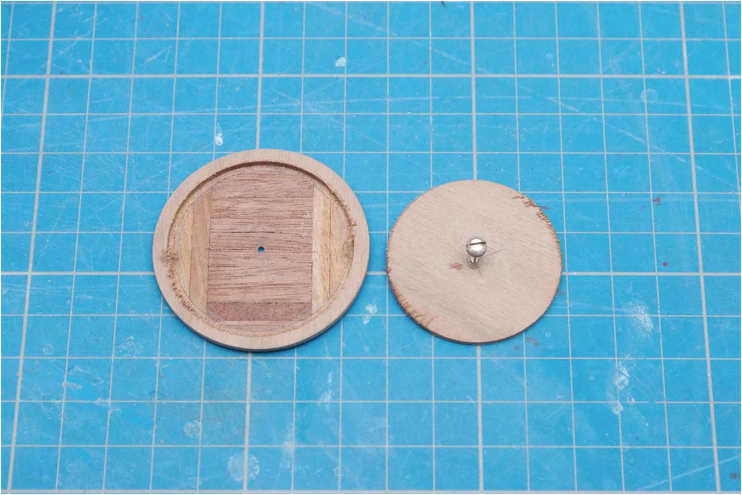 Dazu habe ich eine Furnierholzplatte auf die Plattform gesetzt und diese nur am Rand mit wenigen Klebepunkten verklebt und dann wieder in der Handbohrmaschine abgerundet.
